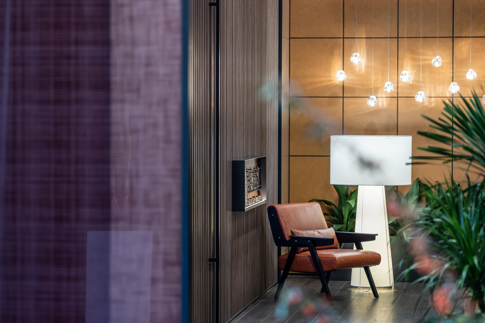 前廳一角,一把隨意的休閑椅構(gòu)設(shè)出安靜而獨立的等候區(qū)。光是一味奇妙而誘惑的催化劑,見證格柵的參差錯落,旖旎于水滴狀通透吊燈,如同午夜巴黎那一杯令人情迷的威士忌,透過光影的變幻,實現(xiàn)精尚定調(diào)。