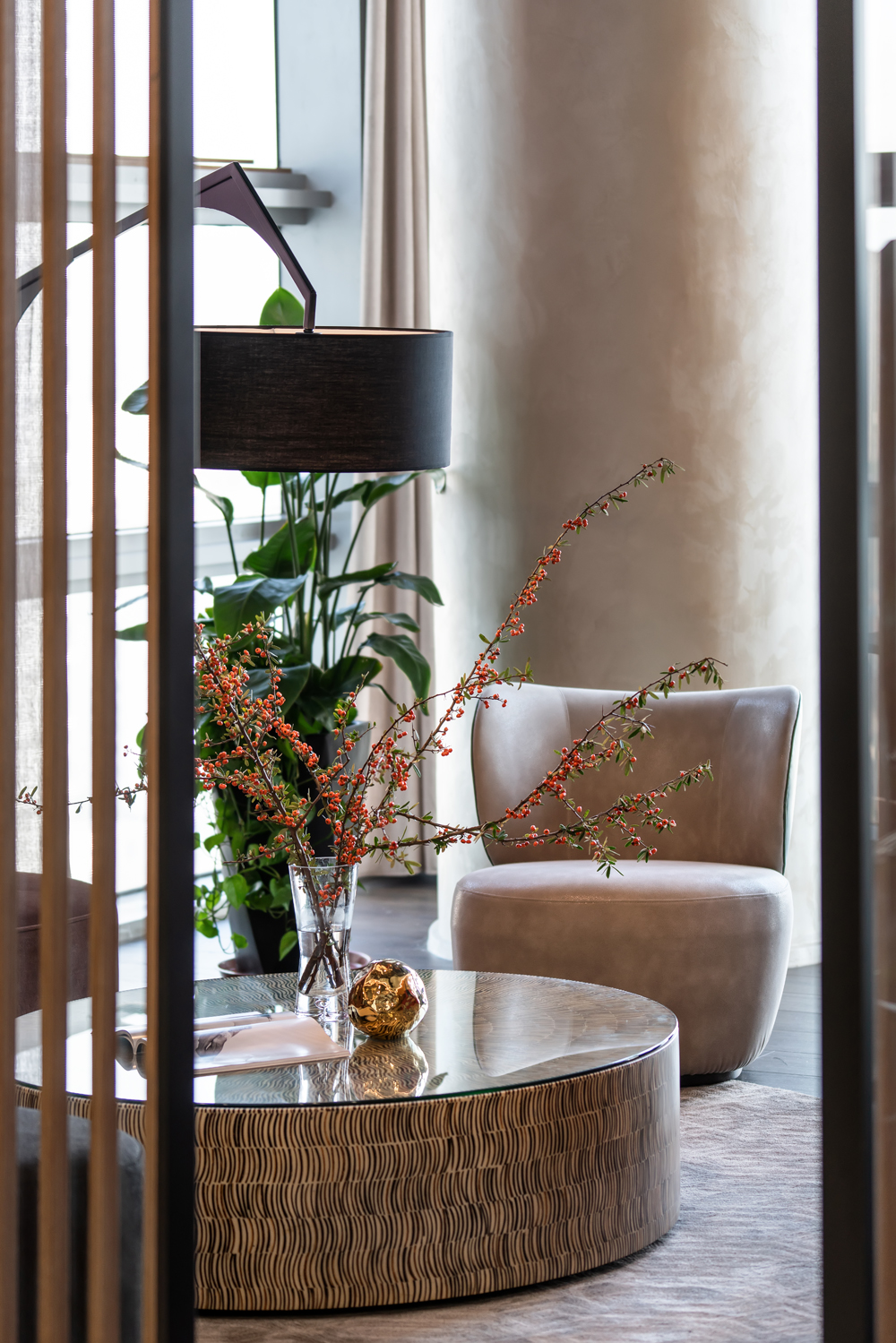 接待區(qū)以弧形沙發(fā)圍合成互動性強的洽談狀態(tài),金屬紋理圓幾在光的參與下呈現(xiàn)精致的一面,格柵半掩,意式沙色時尚簡約家具,凸顯了實用與美學(xué)的無聲契合。