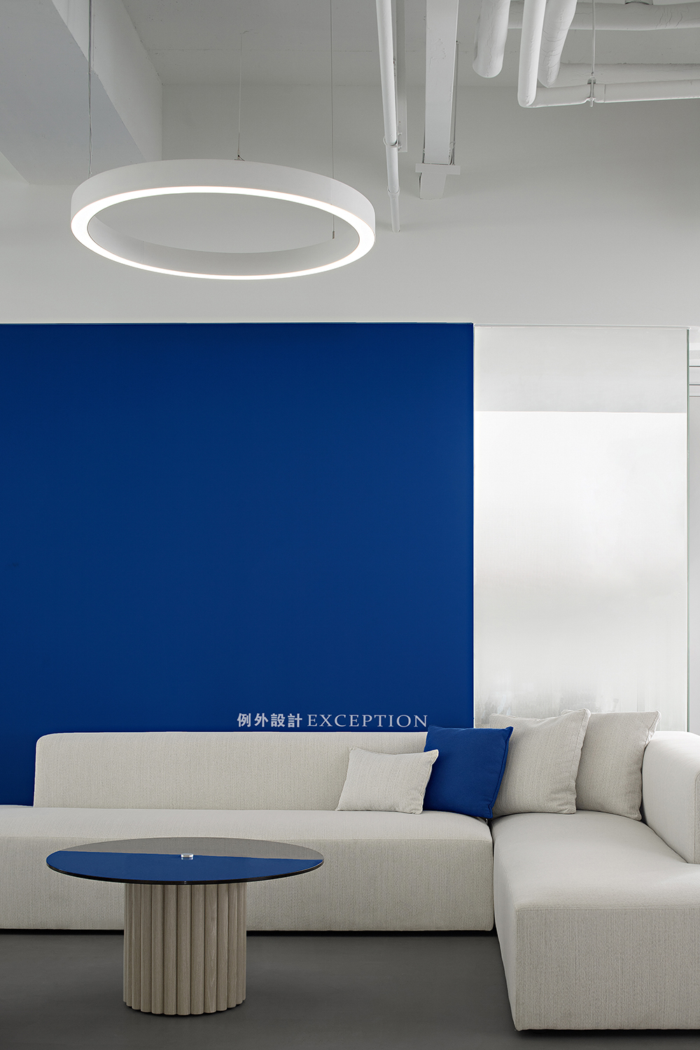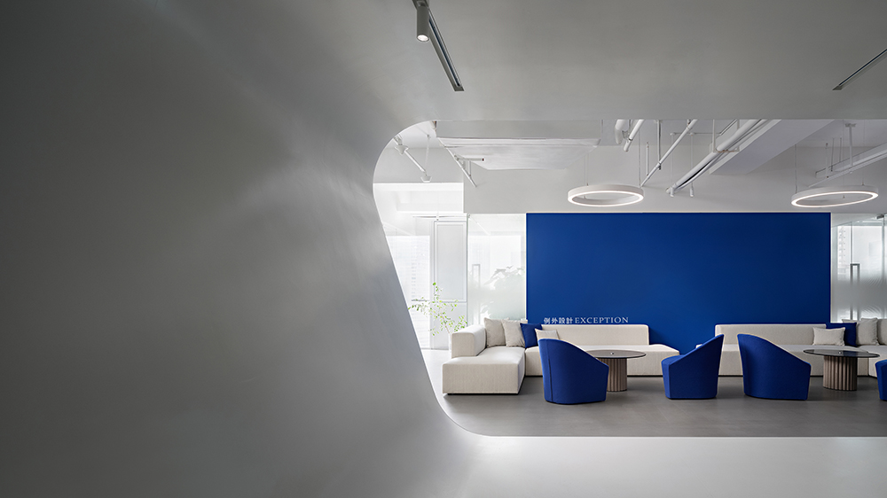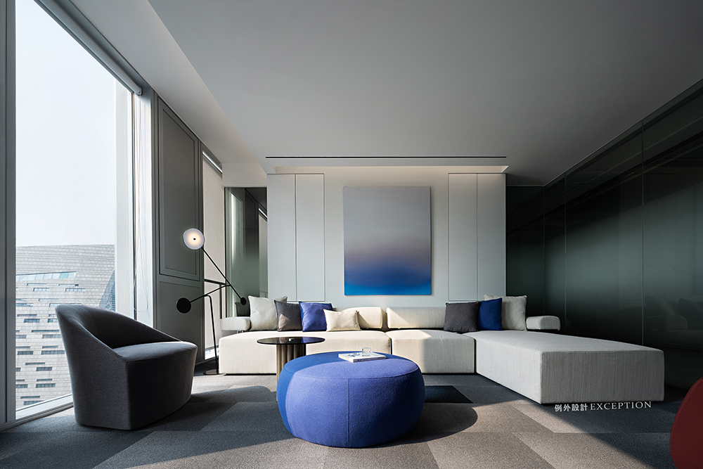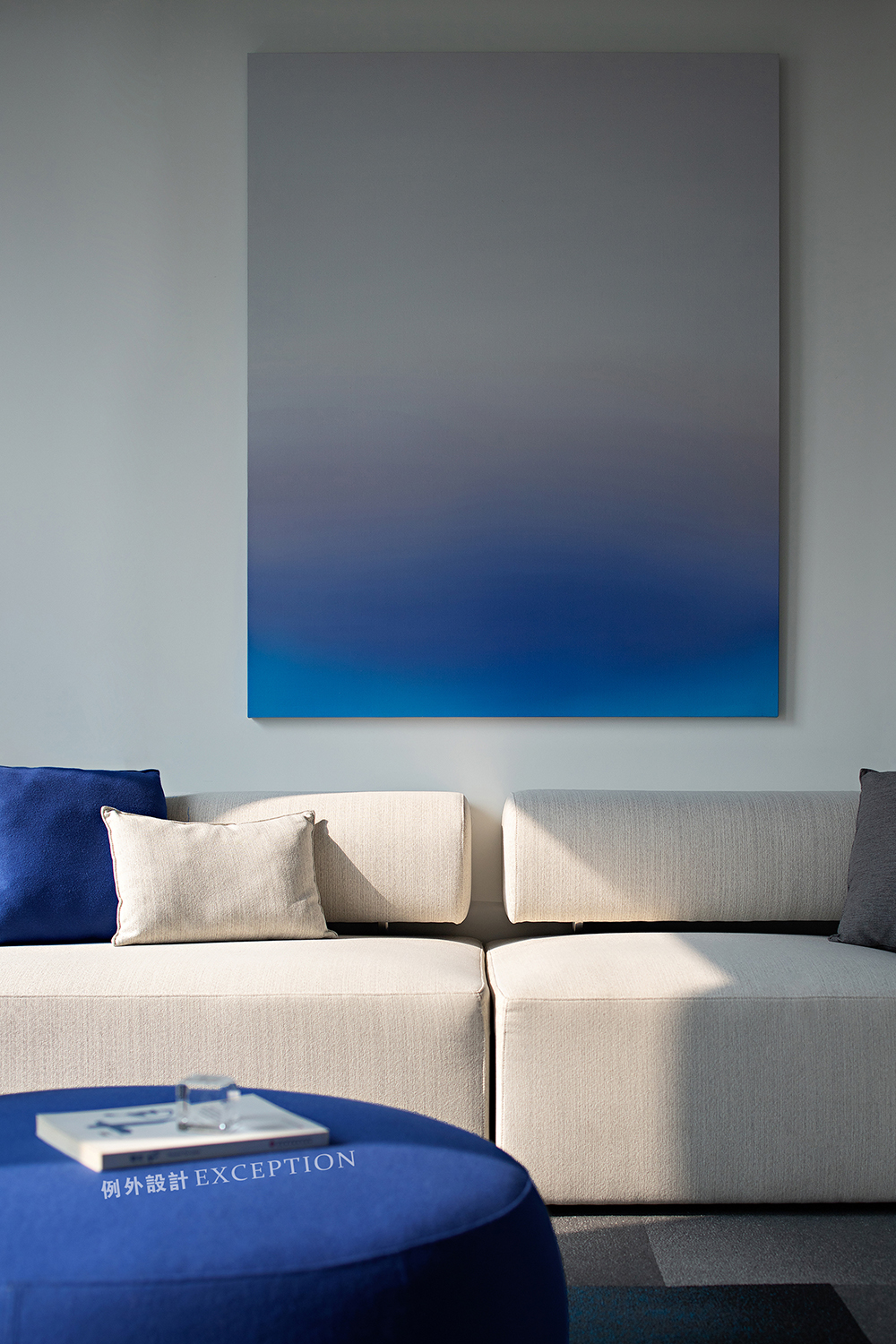 開放式接待區(qū)在形色之間創(chuàng)造出一種輕松明亮的等候氛圍,純凈的克萊因藍(lán)是是一切夢想的開端,隨時靜候靈感的噴薄而出。對稱L型沙發(fā)勾勒出沉浸式多人溝通互動的場景,在當(dāng)下延伸出對未來的思辨與創(chuàng)想。