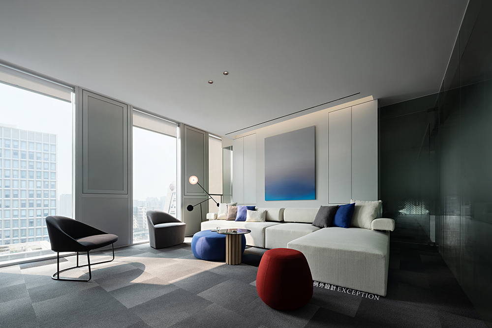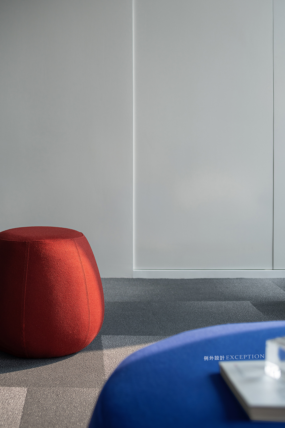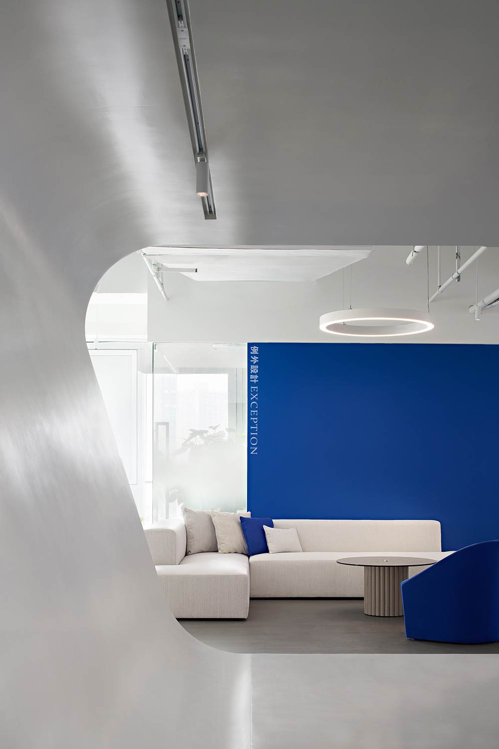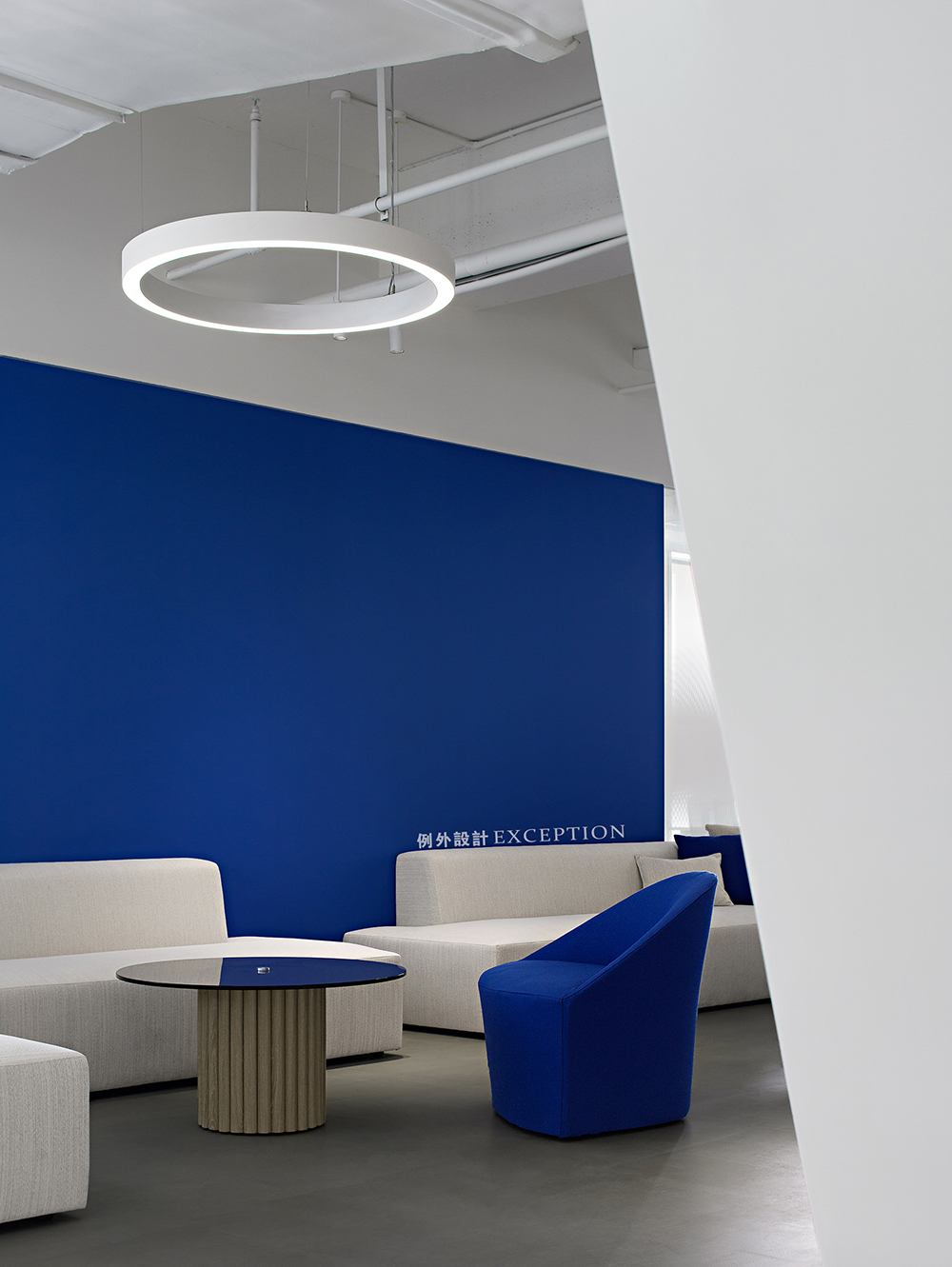 開放式接待區(qū)在形色之間創(chuàng)造出一種輕松明亮的等候氛圍,純凈的克萊因藍(lán)是是一切夢想的開端,隨時靜候靈感的噴薄而出。對稱L型沙發(fā)勾勒出沉浸式多人溝通互動的場景,在當(dāng)下延伸出對未來的思辨與創(chuàng)想。