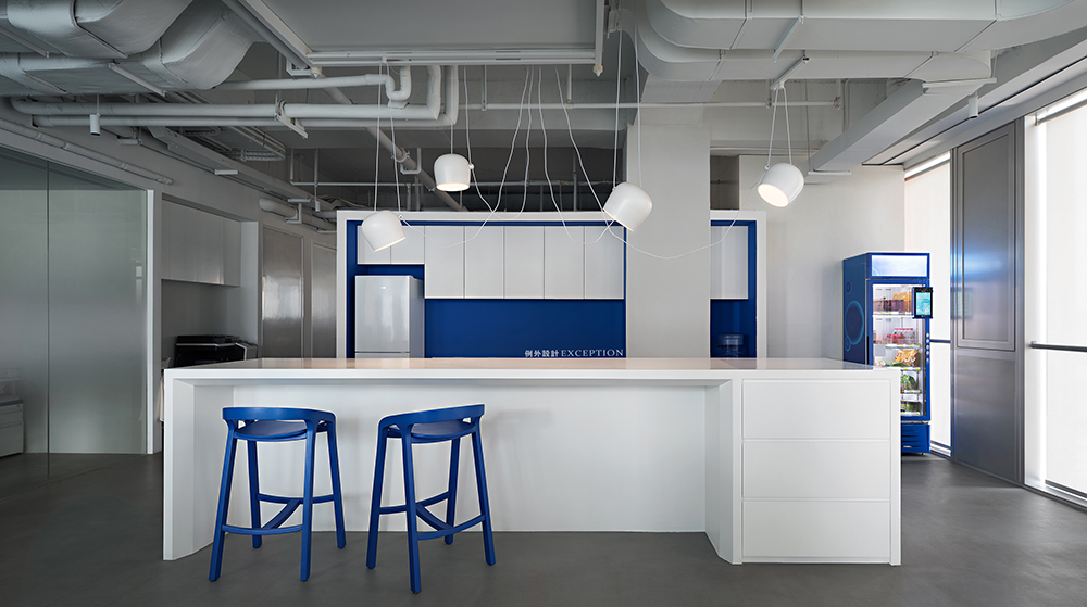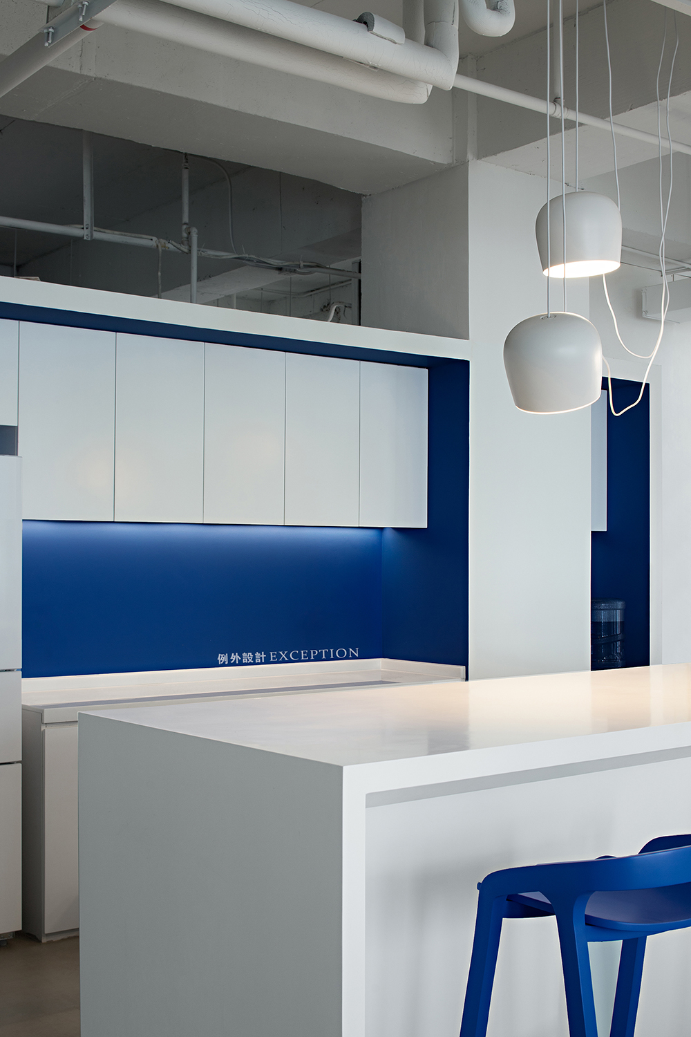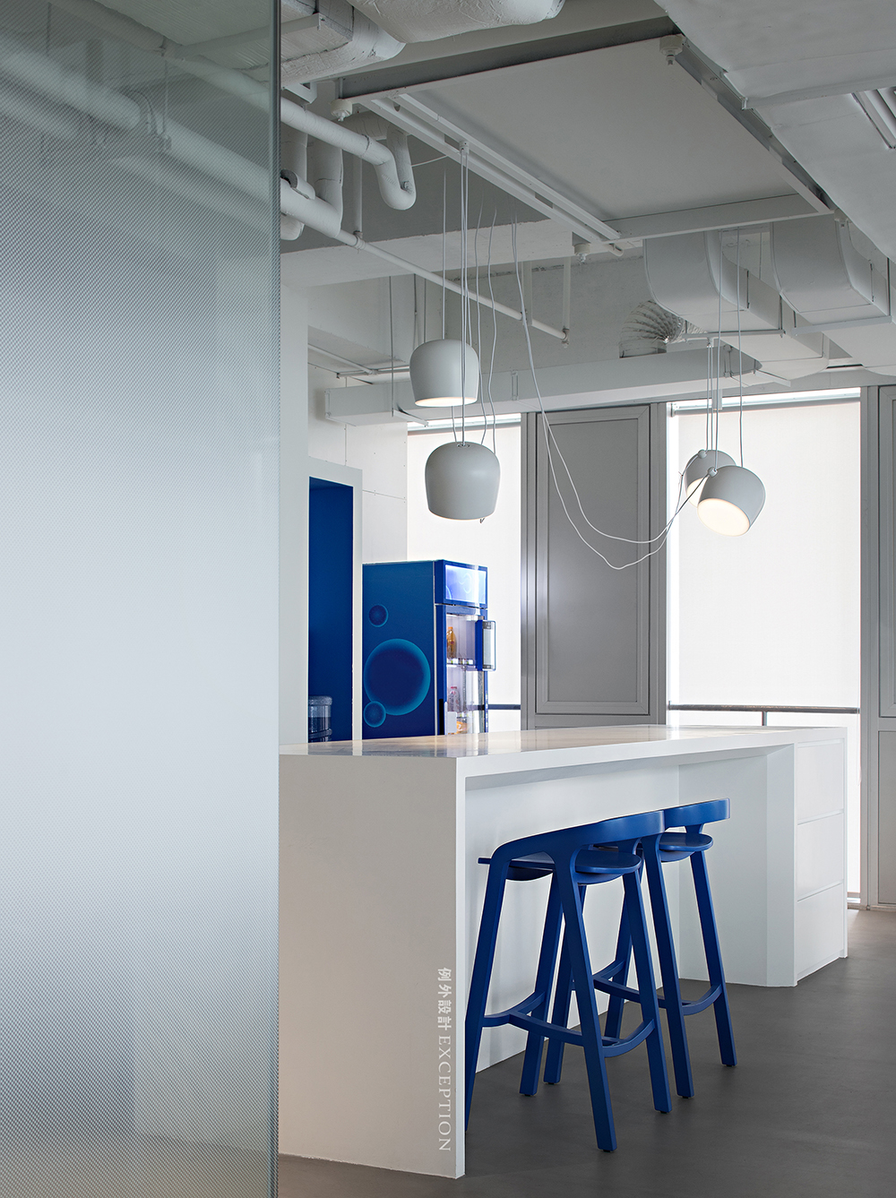 辦公區(qū)依舊遵循簡潔高效的設(shè)計原則,沒有邊界、沒有過多的贅飾,真正創(chuàng)建一個讓大家自由放松、靈感迸發(fā)的空間,扁平化的工作管理與交流,對于工作中隨時可能出現(xiàn)的需求變化,一個開放透明的環(huán)境更有利于團隊迅速做出反應(yīng),靈活彈性地隨機應(yīng)變。無意闖入的克萊因藍(lán)似乎打破了某種平衡,形成新奇的視錯覺,活躍了辦公氣氛。