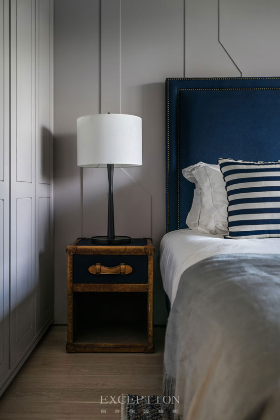 床頭的深藍來自心中描繪的海洋世界,描金方柜是那藏著奇妙力量的寶盒,夢里的小男孩滿懷勇氣,去追尋心中的秘境。