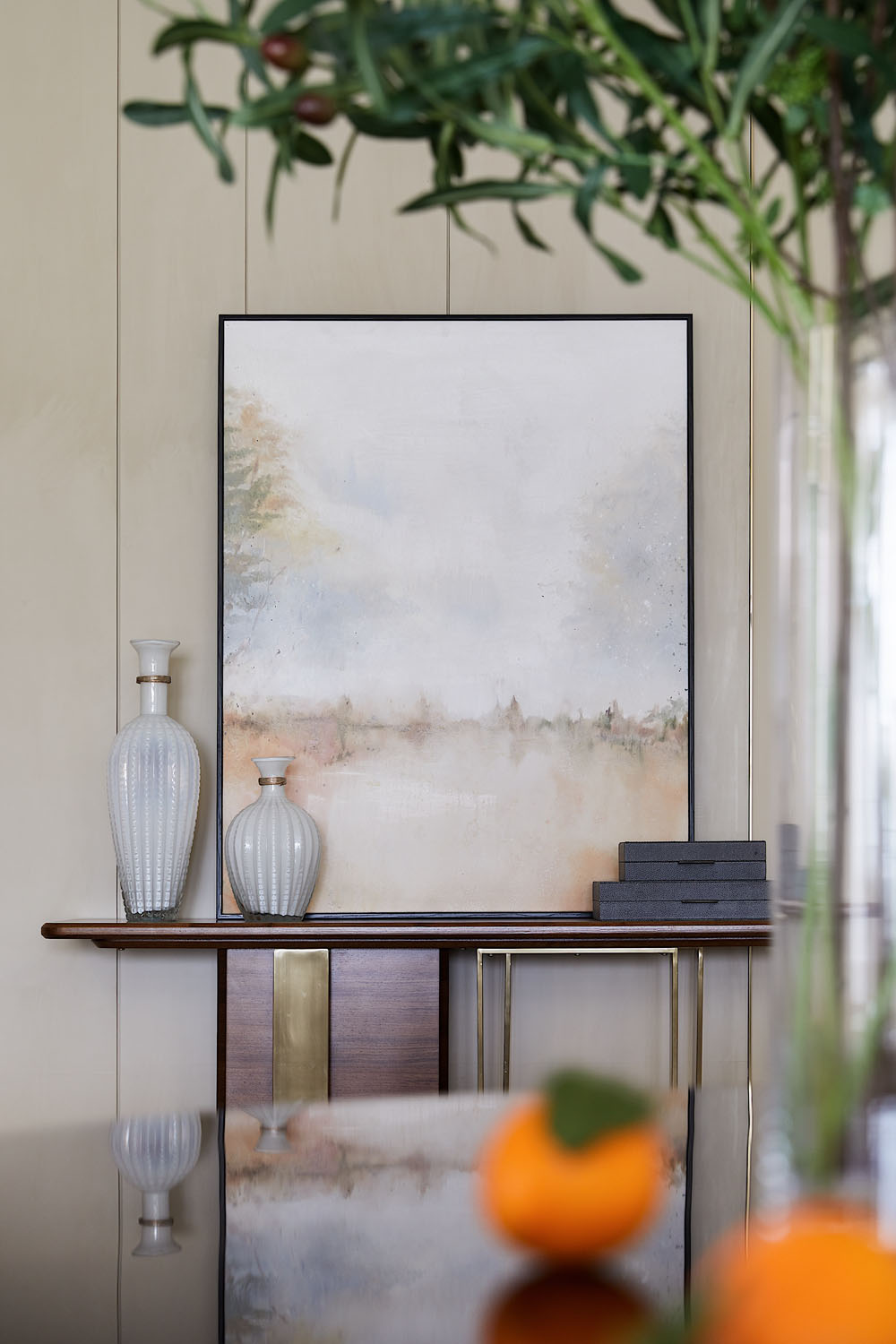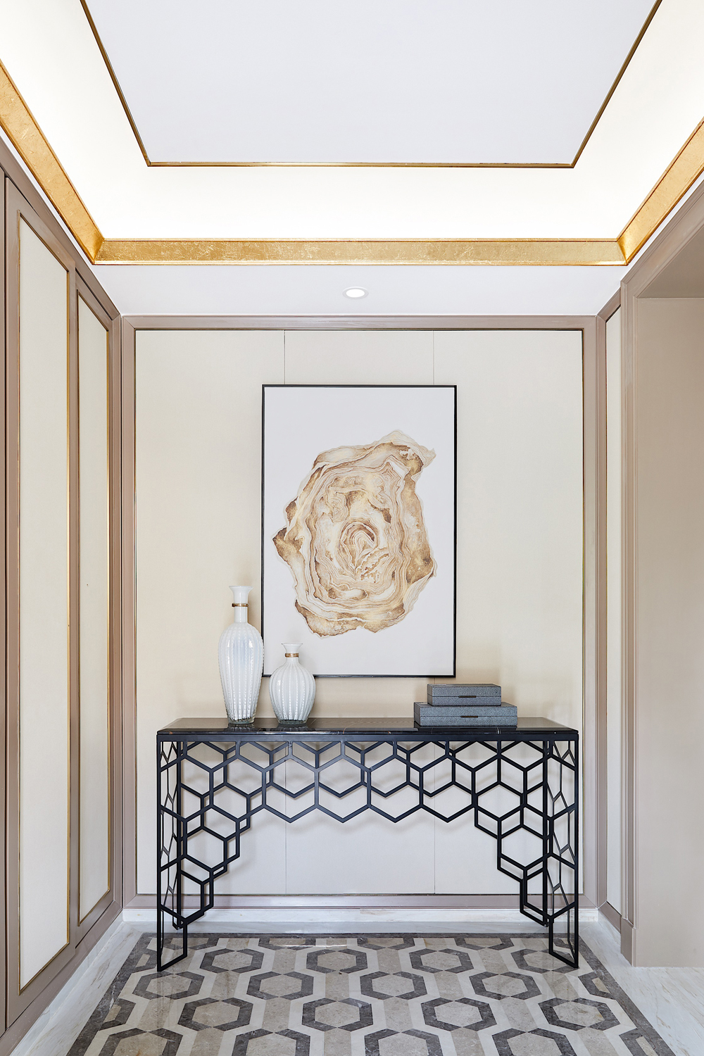 在玄關(guān),圍繞主題展開(kāi)的蜂巢造型端景臺(tái),通過(guò)幾何變換延伸出輕盈別致的藝術(shù)性。裝飾畫(huà)似金色玫瑰優(yōu)雅綻放,又仿若花蜜清瑩欲滴,恰到好處點(diǎn)綴了空間的視覺(jué)中心,勾勒出彬彬有禮的迎迓場(chǎng)景。