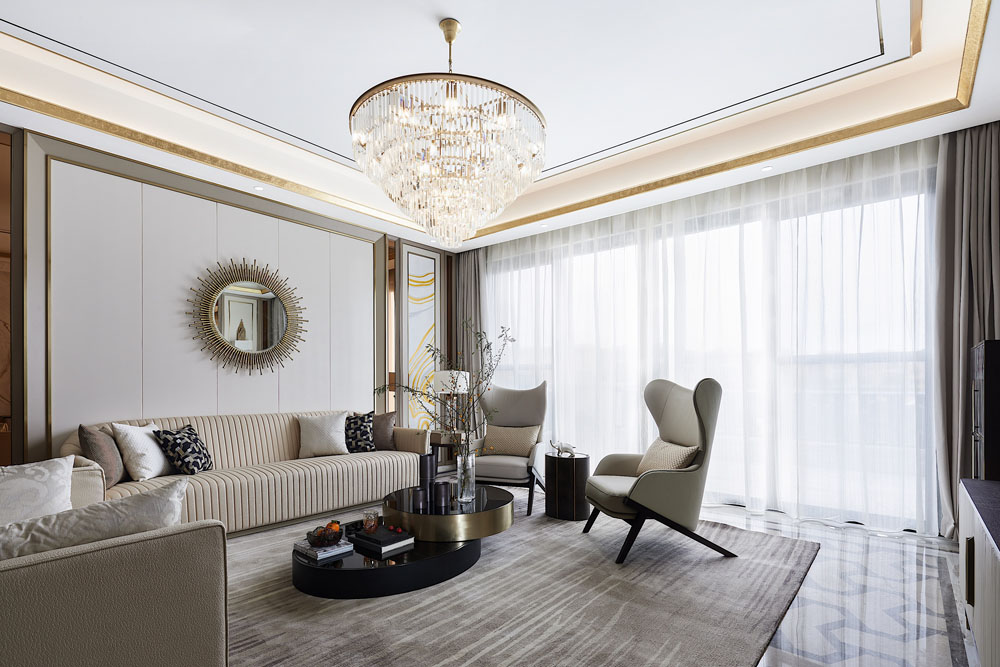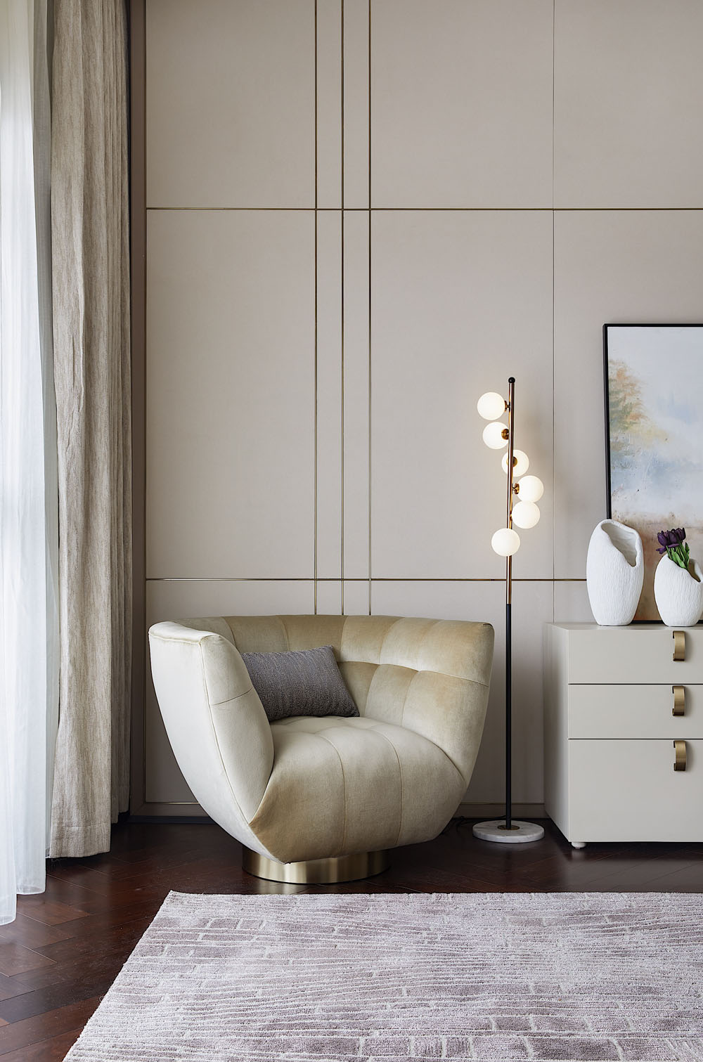 生活是精神意識(shí)的再現(xiàn),所謂的奢華,是拋開(kāi)表象之后所獲得精神上的愉悅與清寧。米色的溫柔與金屬的質(zhì)感打造出素雅精致的藝境。清風(fēng)徐來(lái),透過(guò)紗簾悄悄融入親朋間的溫馨家常。想象需要被預(yù)留空間,讓每一天都充滿未知的驚喜。