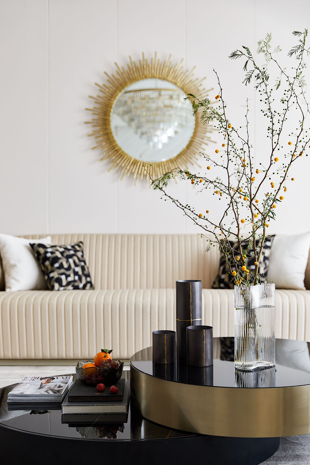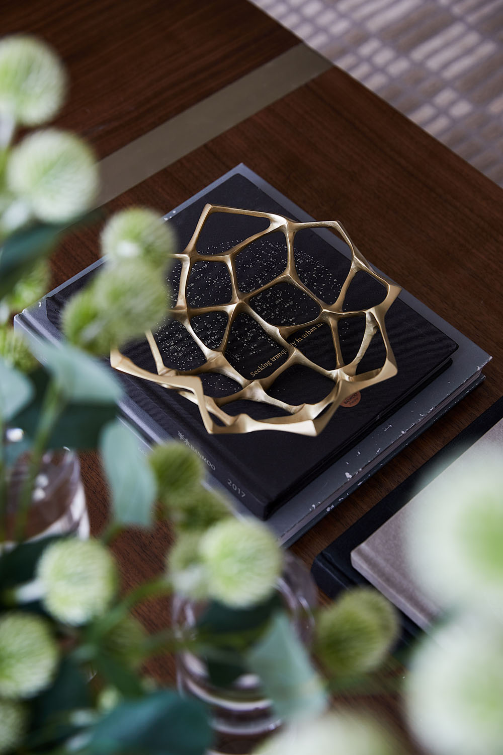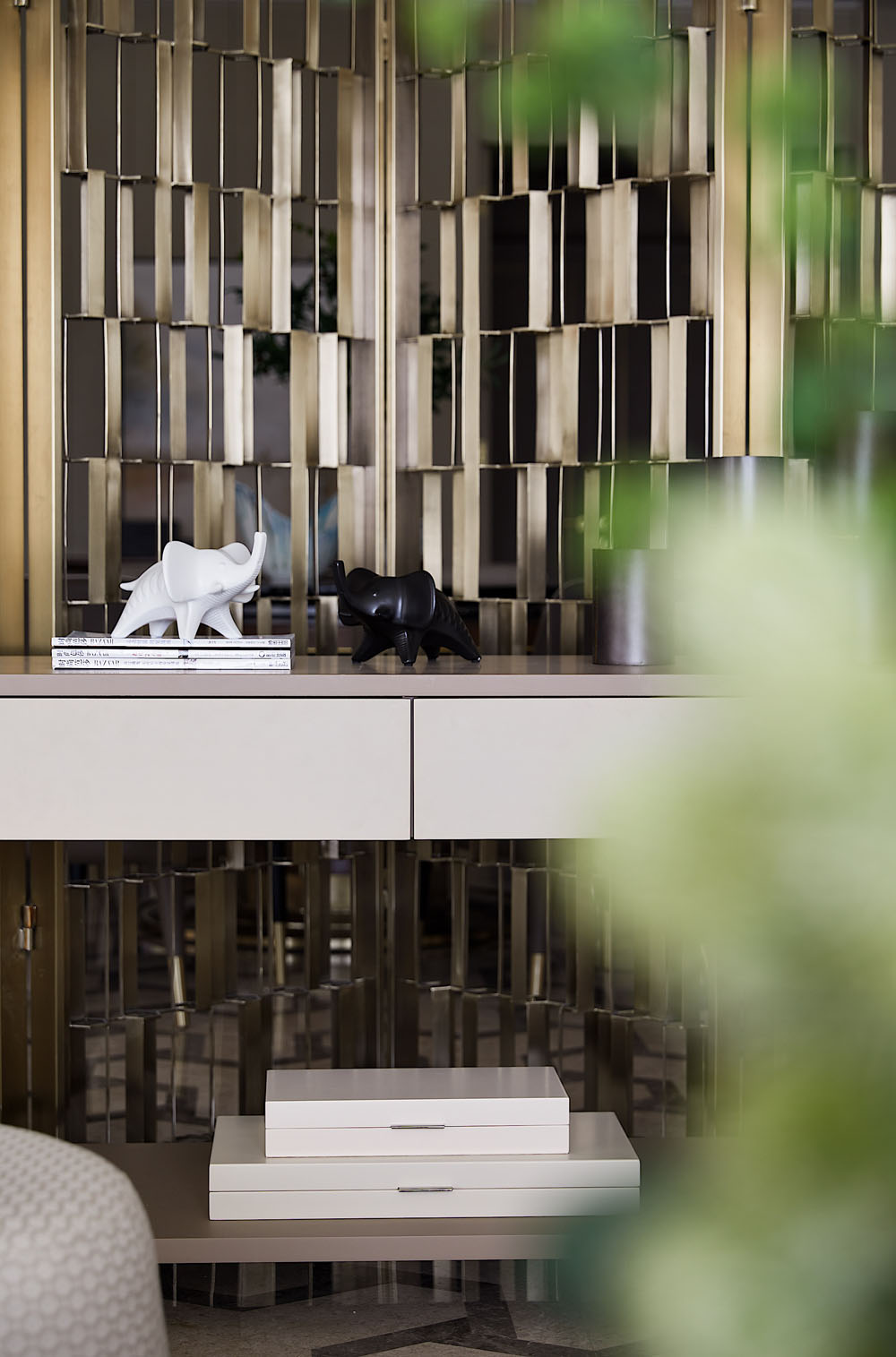 “蜂巢”的靈感概念在空間不斷延續(xù),小圓墩上的暗紋肌理依舊能看出設(shè)計(jì)所想表達(dá)的家的凝聚力和安全感。金屬鏤空隔斷增加了視覺(jué)上的層次,和質(zhì)地考究的黑金碗蓮擺件一起讓家的精致氣息脫穎而出。