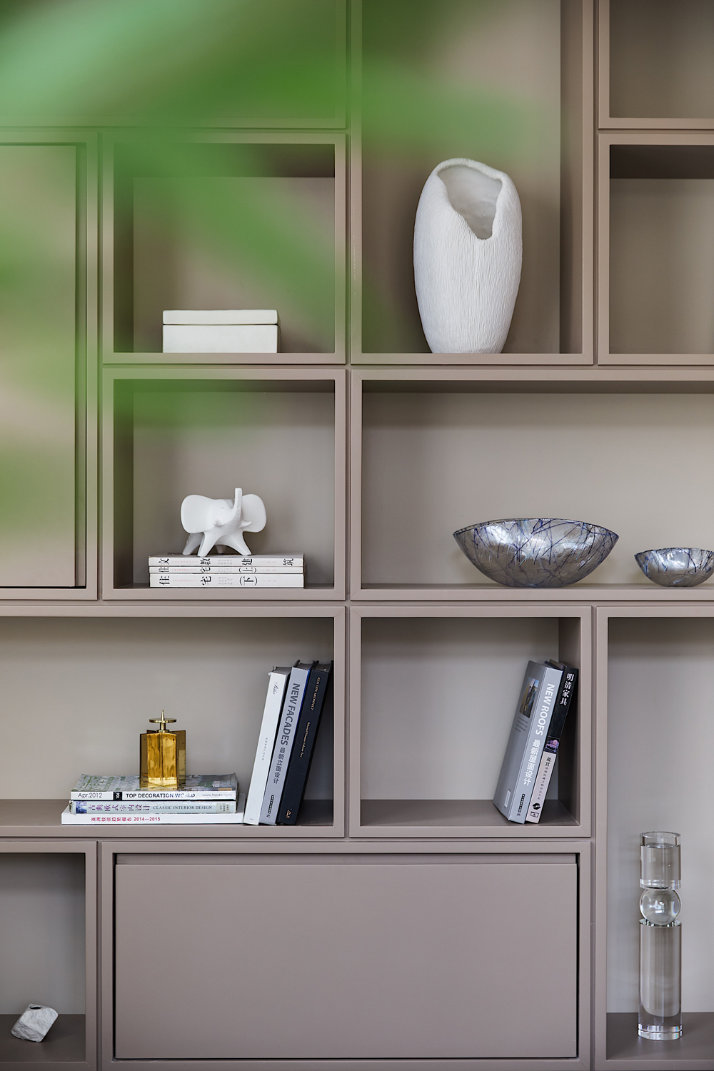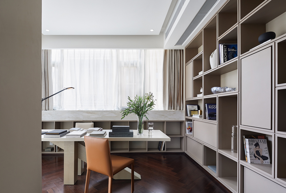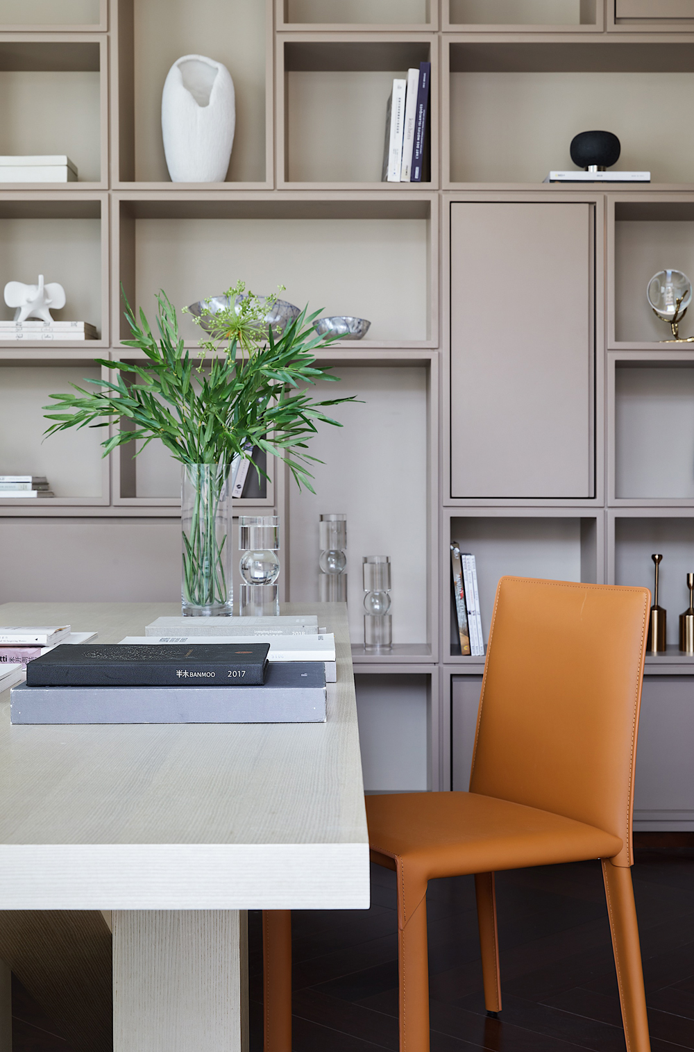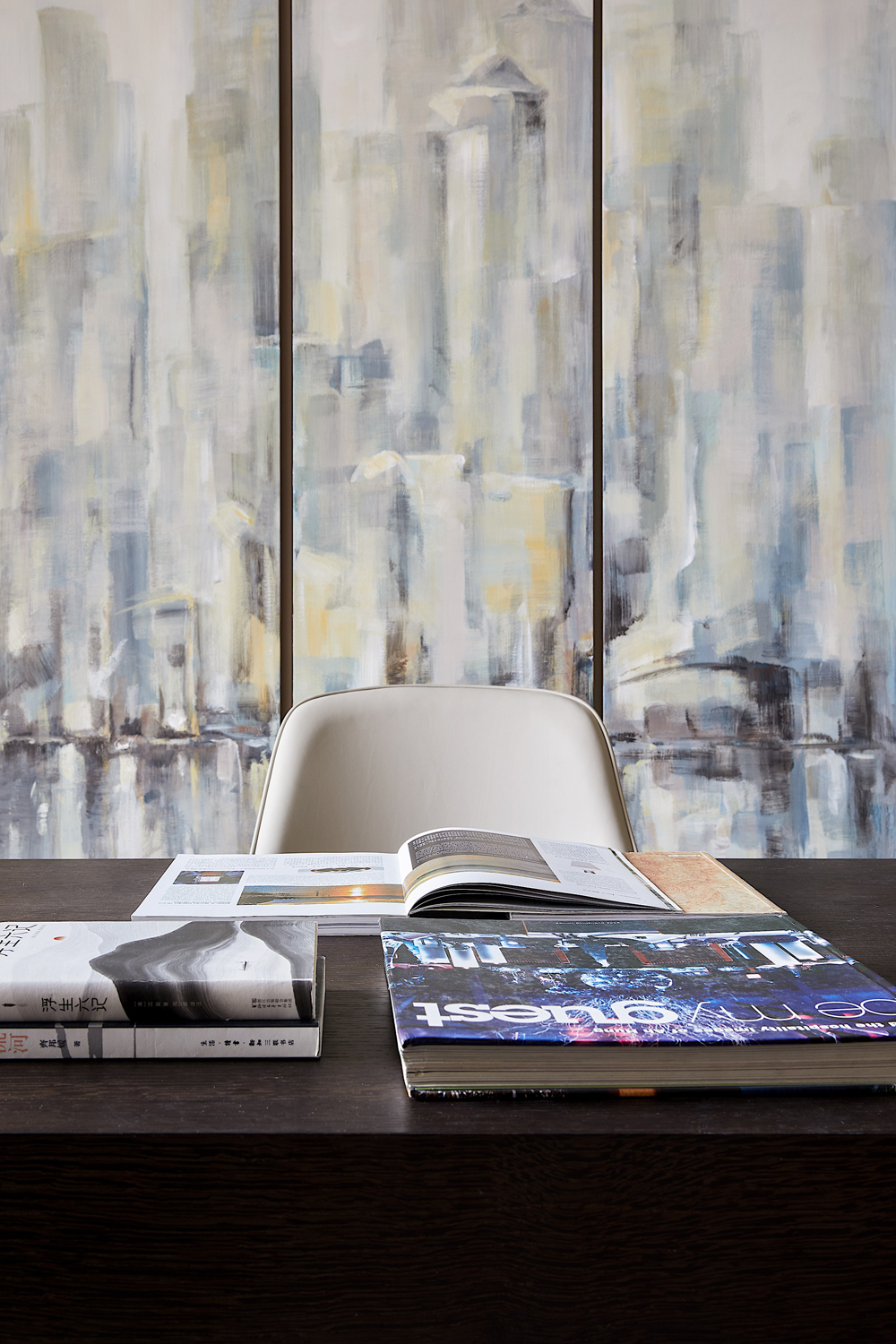 書(shū)房位于主臥套房中,空間井然有序,頂天立地式書(shū)櫥陳列著居者的藝術(shù)藏品,身后柜門(mén)上抽象手繪畫(huà)更是將溫厚的人文氣質(zhì)刻畫(huà)得淋漓盡致,書(shū)中錦繡三千,任居者肆意揮灑。