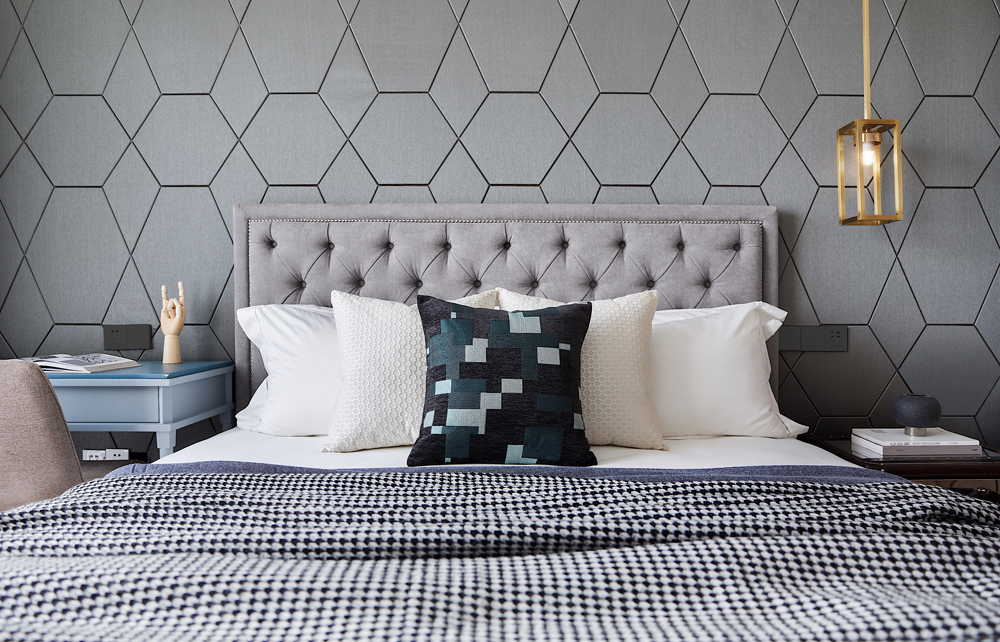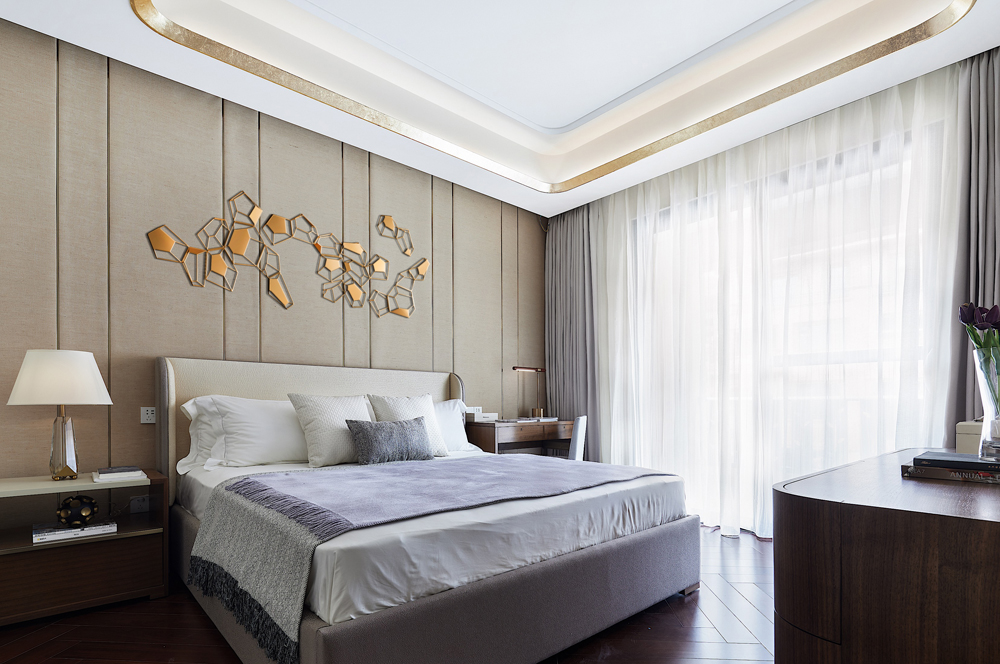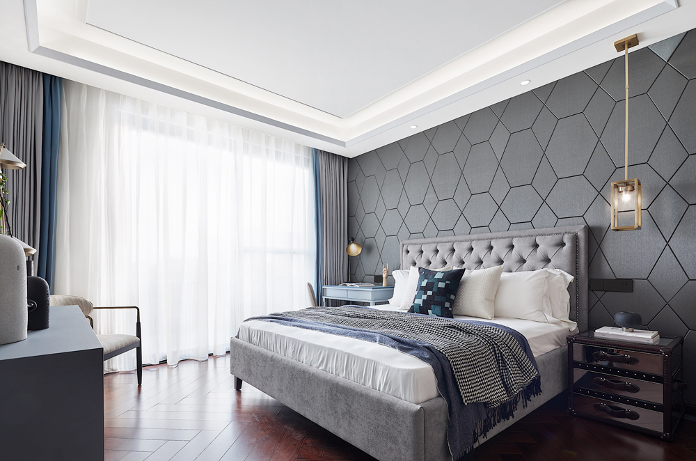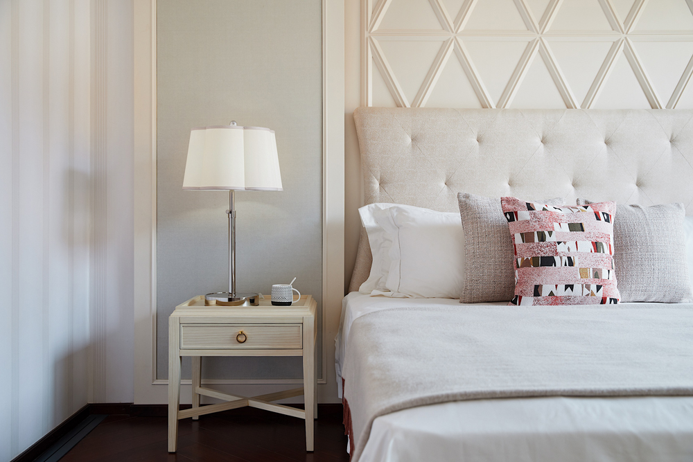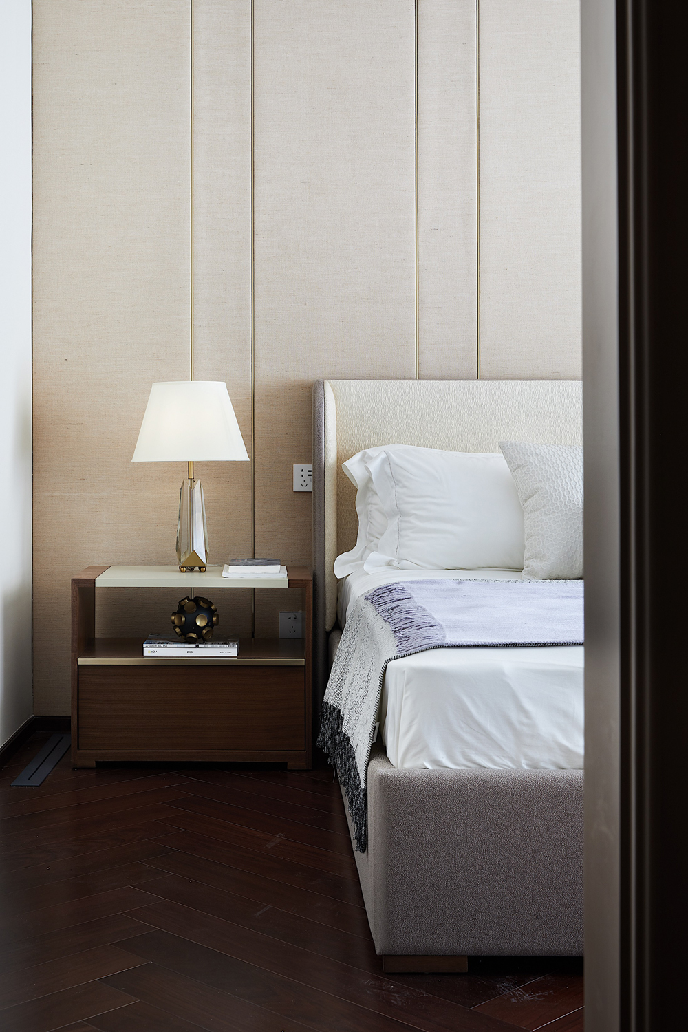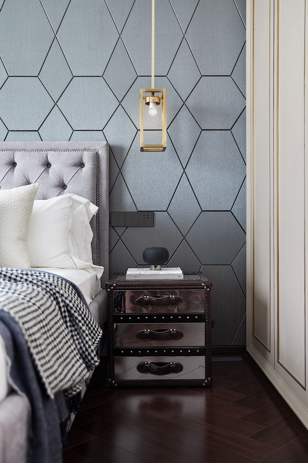 床頭以輕柔的軟包打造,趣味多元的幾何線條勾勒出個(gè)性的視覺(jué)張力,令空間在低飽和度的色彩中跳脫出輕靈的節(jié)奏感,生活與藝術(shù)在此靜謐融合。