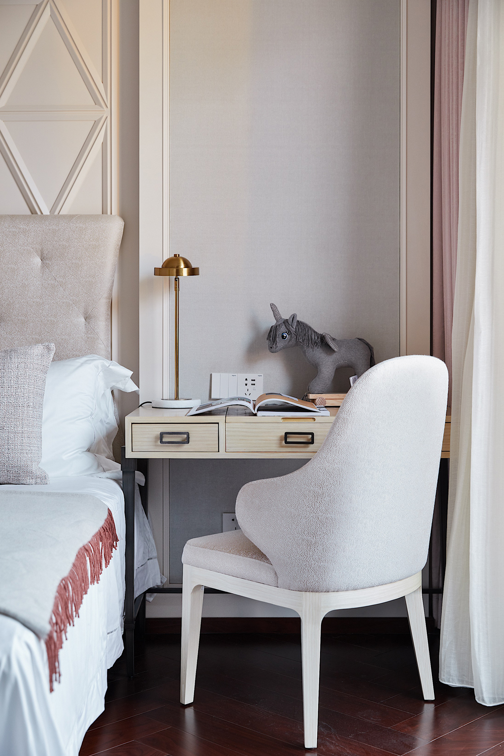 男孩房床頭背景是經(jīng)過(guò)變幻后的蜂巢概念,規(guī)整的幾何排布益于孩子思維的拓展開(kāi)發(fā),不同色塊的組合與千鳥(niǎo)格的搭配,是一種潛移默化的美學(xué)投射,孩子自由成長(zhǎng)不受限。
