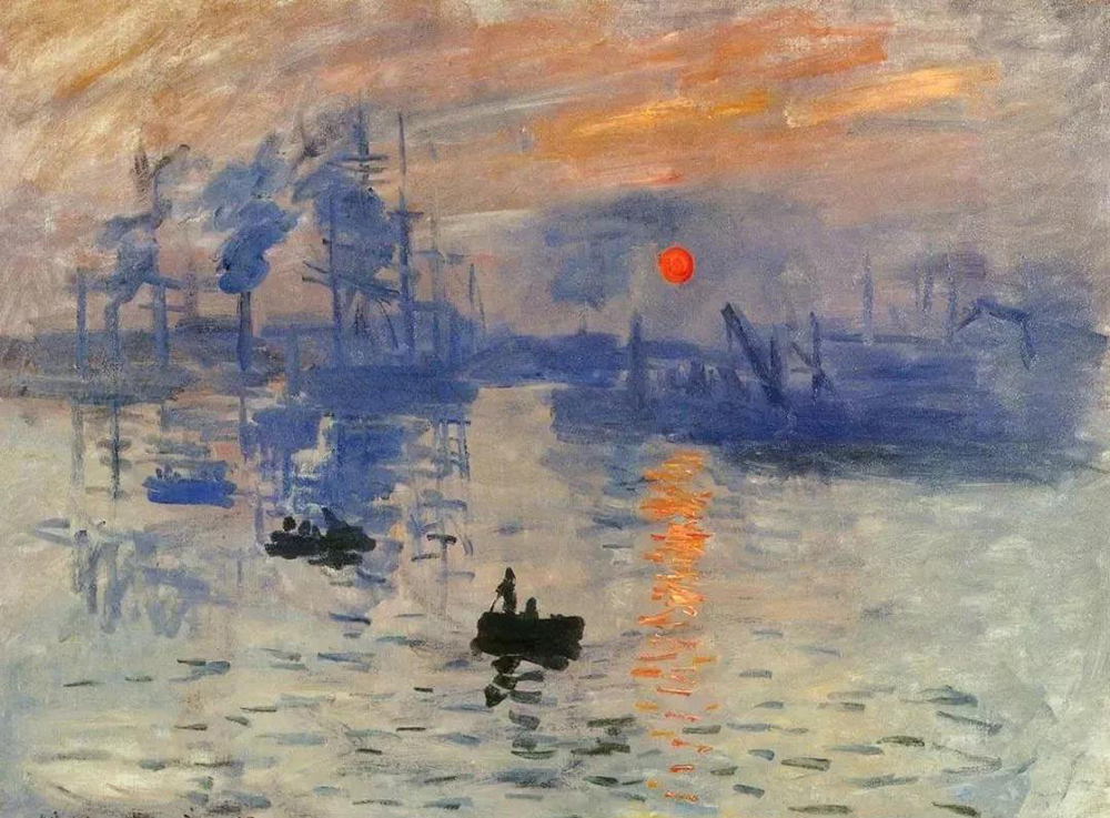 在家鄉(xiāng)勒阿弗爾港眺望到藍色的海面上,橙紅色的日出緩緩升起,莫奈懷著熱情創(chuàng)作了《日出·印象》。