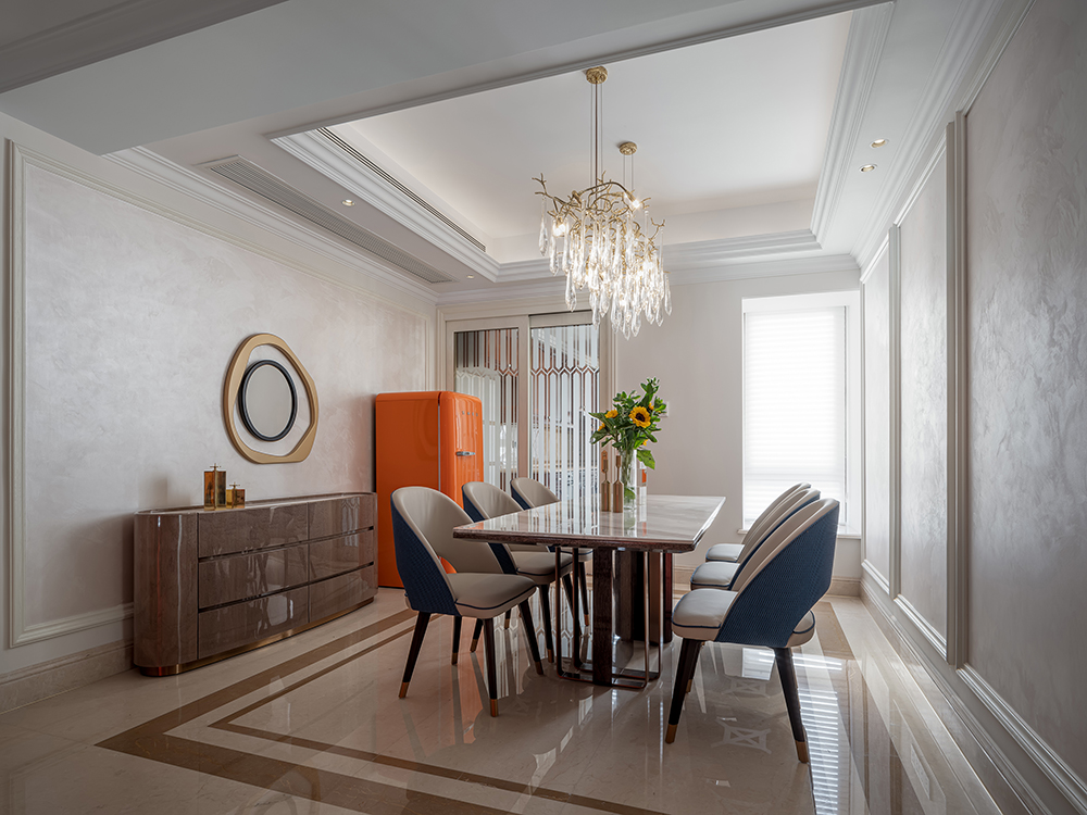 原戶型中一成不變的泛黃陳舊感,由爽凈簡約的白色所替代。在輕盈的底色上,軟飾加載典雅藍和暖意橙,營造極具視覺沖擊力的品質感。長直型空間闊然敞開,開合出高朗尊貴的廳室風態(tài)。