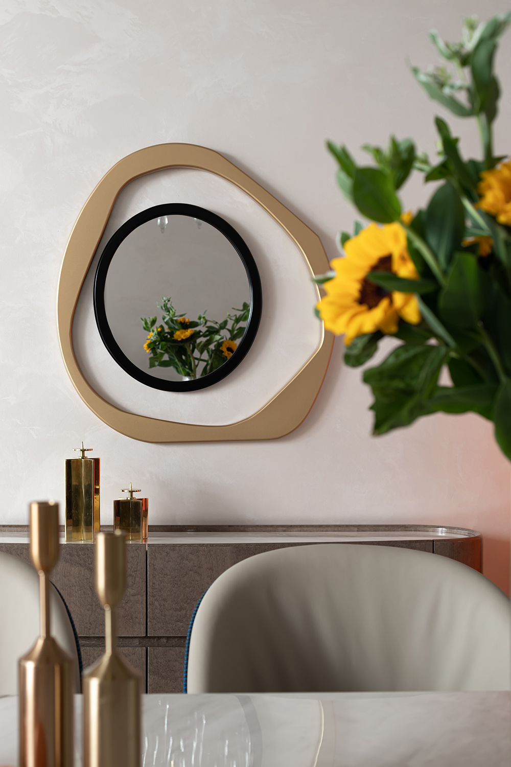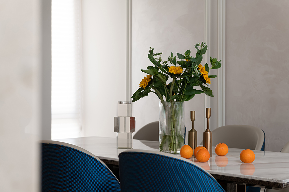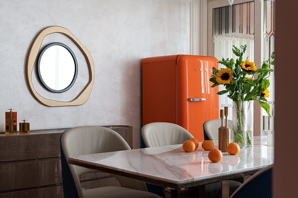 餐廳在延續(xù)空間主調的前提下,多了一絲純粹的意蘊。精心挑選的橙色冰箱與餐桌上清麗的花葉勾起饗食的欲念,古銅波紋裝飾鏡折射出靜謐和樂的空間氣質,空間是背景,陳設是前景,而中間則是生活本身,目光所及,春光明媚,生命美好。