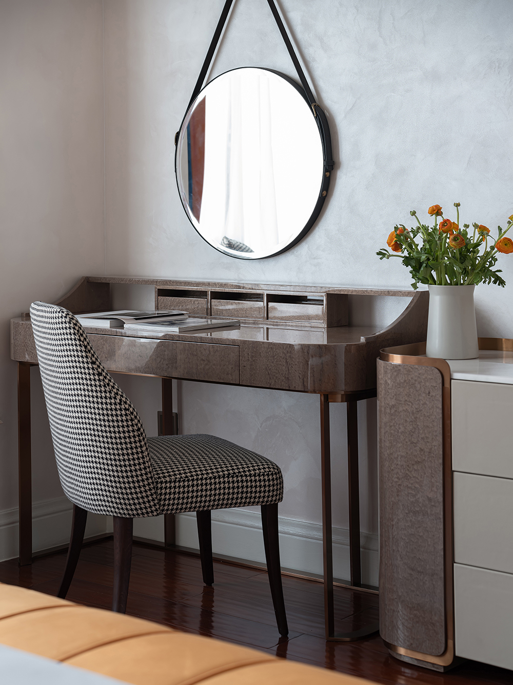 我們堅持通過材質與生俱來的魅力還原居住的真實,在喧鬧背后,生活的溫度、情感、記憶仍然有跡可循。千鳥格的優(yōu)雅,幾何燈的精致,不經(jīng)意間將主人的個性氣質顯露于外。