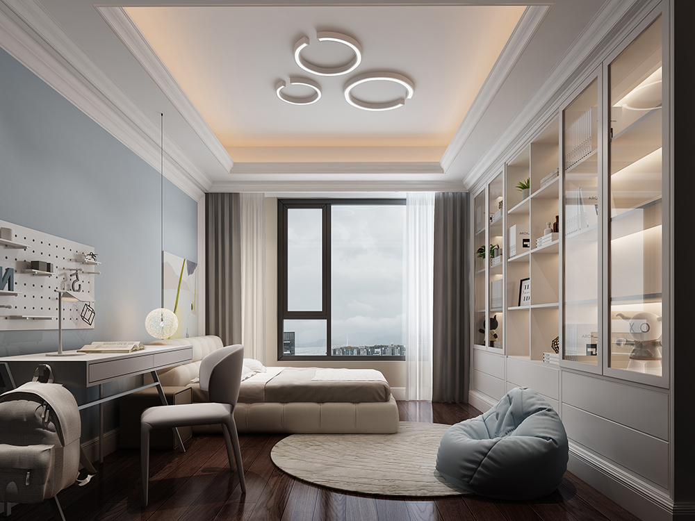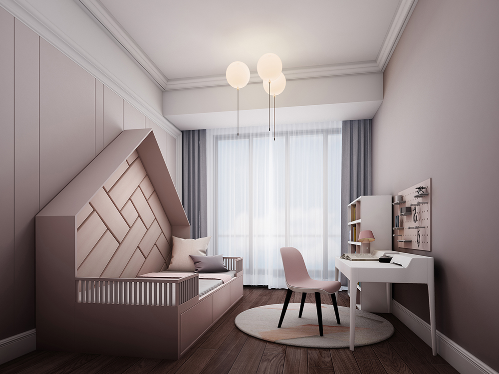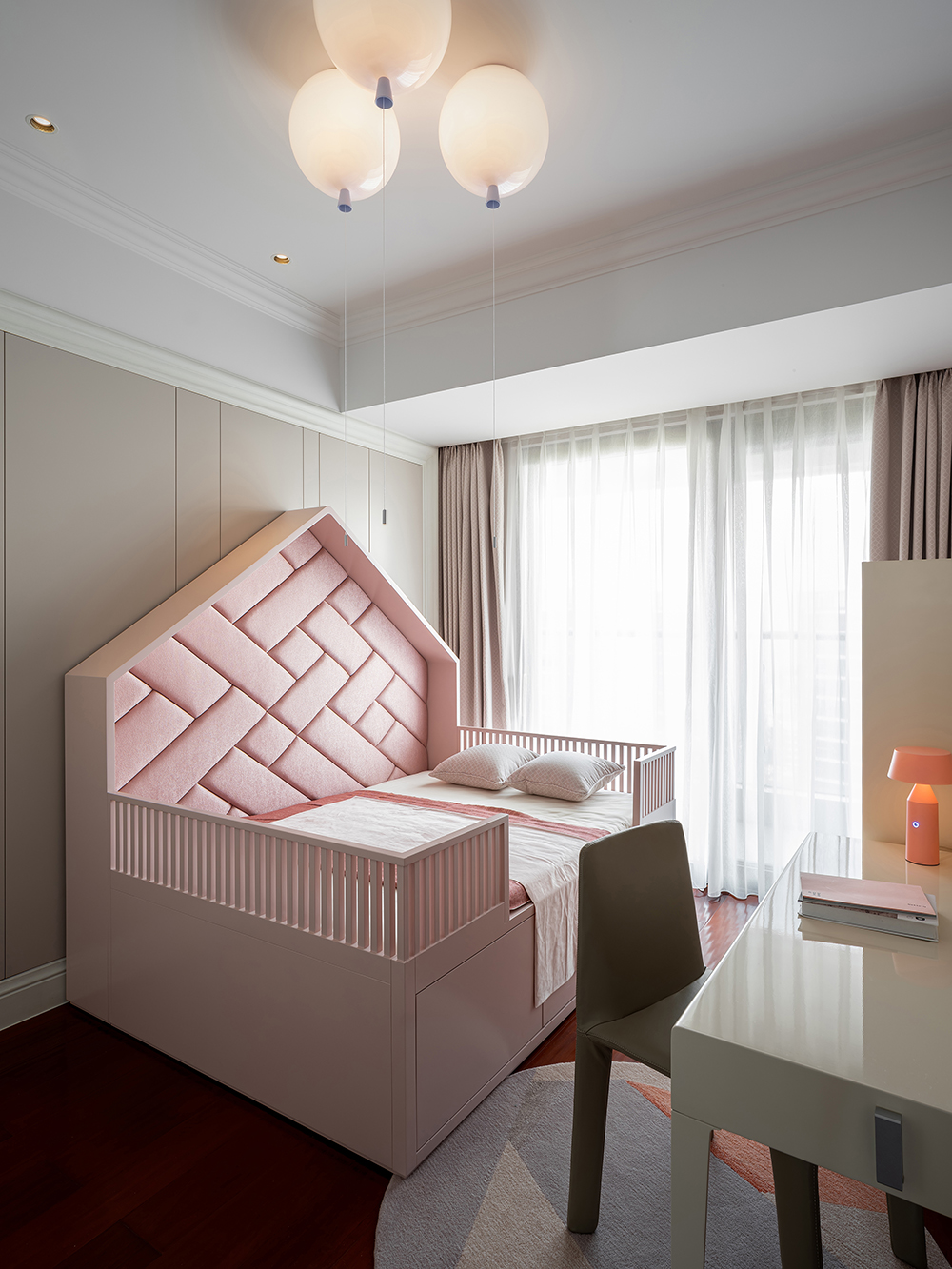 小女兒房承襲最柔和夢幻的櫻語粉,活潑童趣的氣球燈,編織屋頂?shù)墓鞔?,實用且兼具表現(xiàn)力。成長性設計考慮到孩子的成長,在未來的時間里,便捷可移動替換的床具留給居者更多的創(chuàng)造可能。