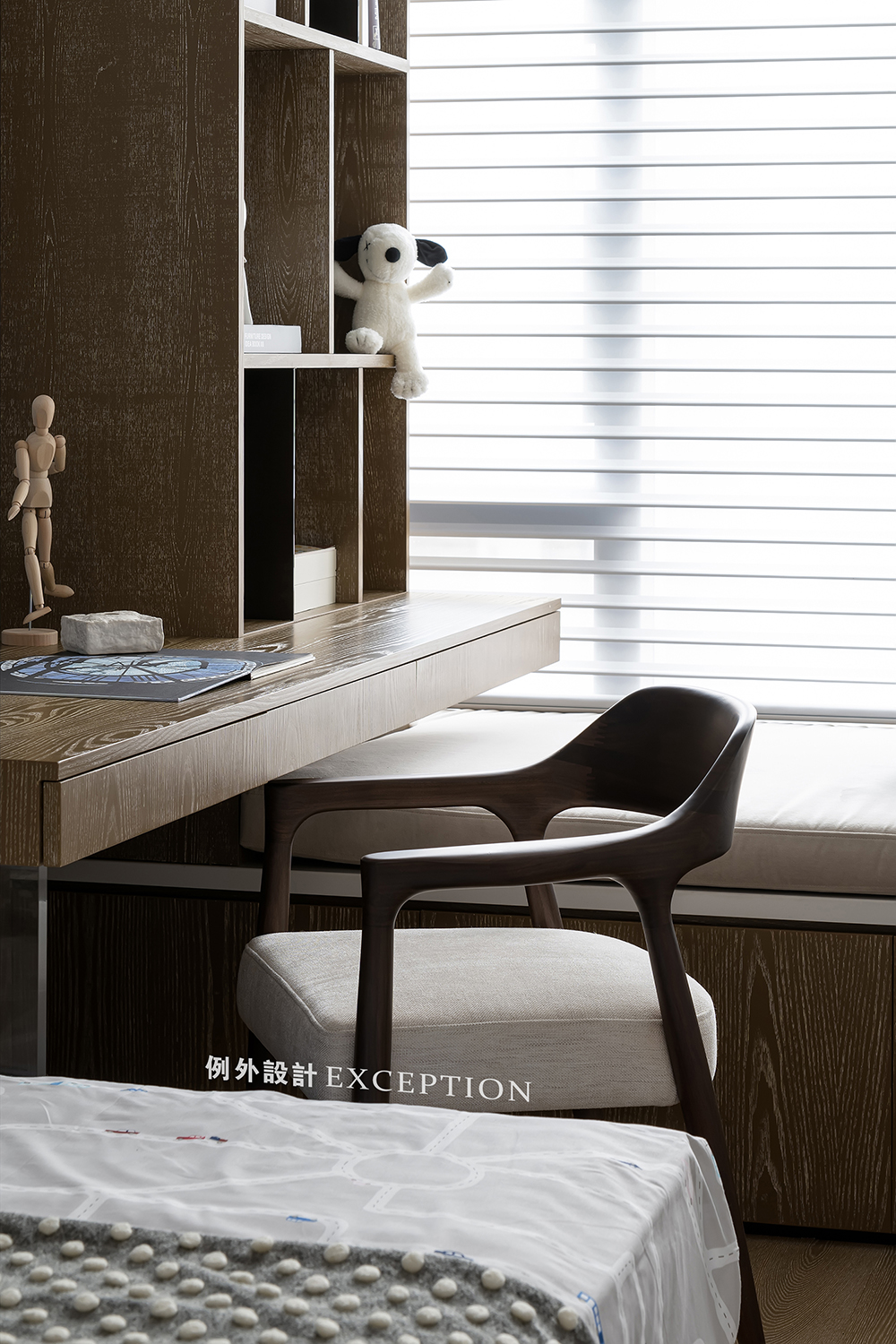 主臥空間以極具包容的大地色系敘述著空間的溫柔靜美,自然的光影輕歌曼舞,設(shè)計悄無聲息地營造著生活的場景,窗臺邊賞景品茶,興起時伏案創(chuàng)作,在專屬的空間,發(fā)掘生活的趣味與溫情。
