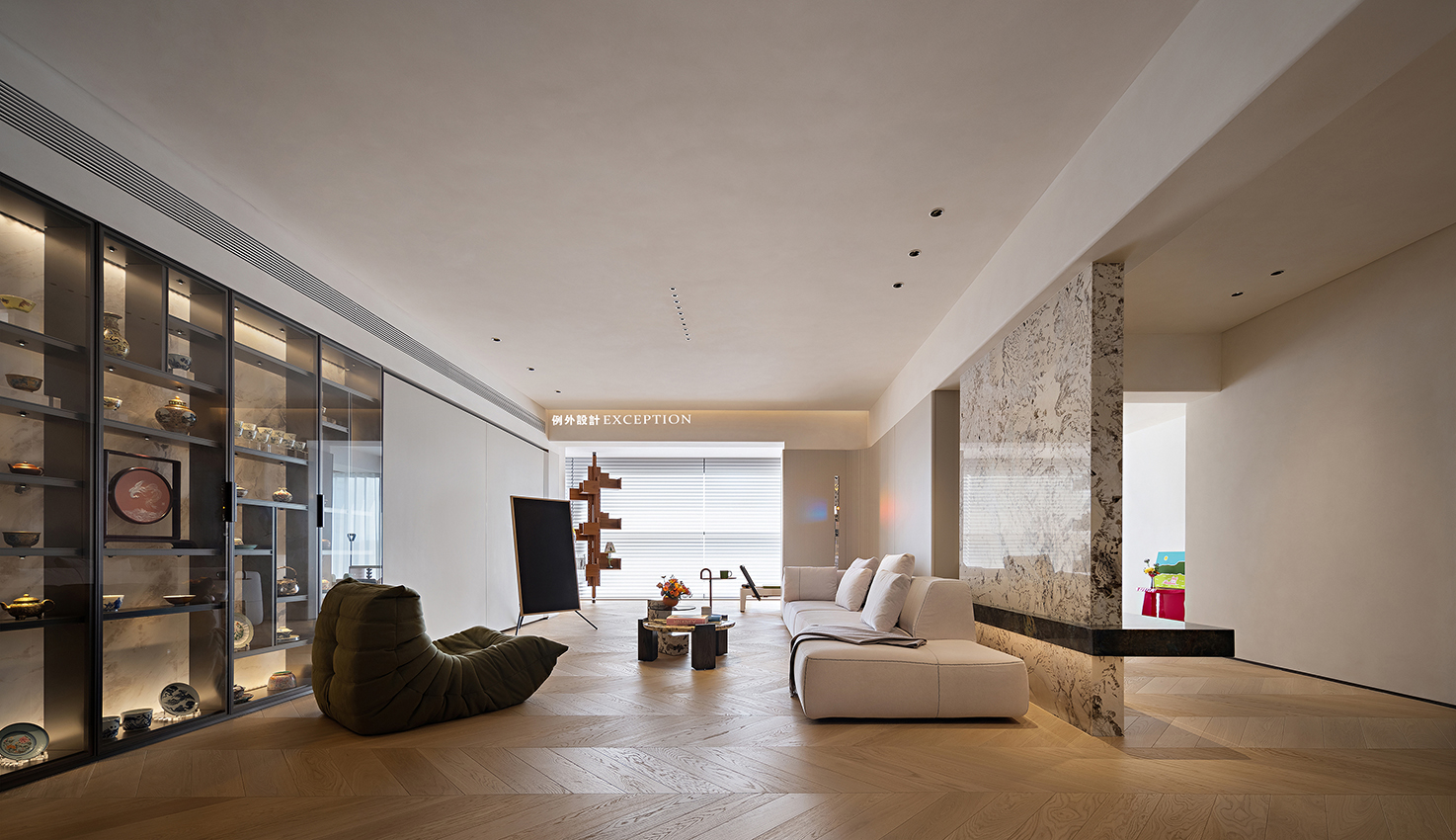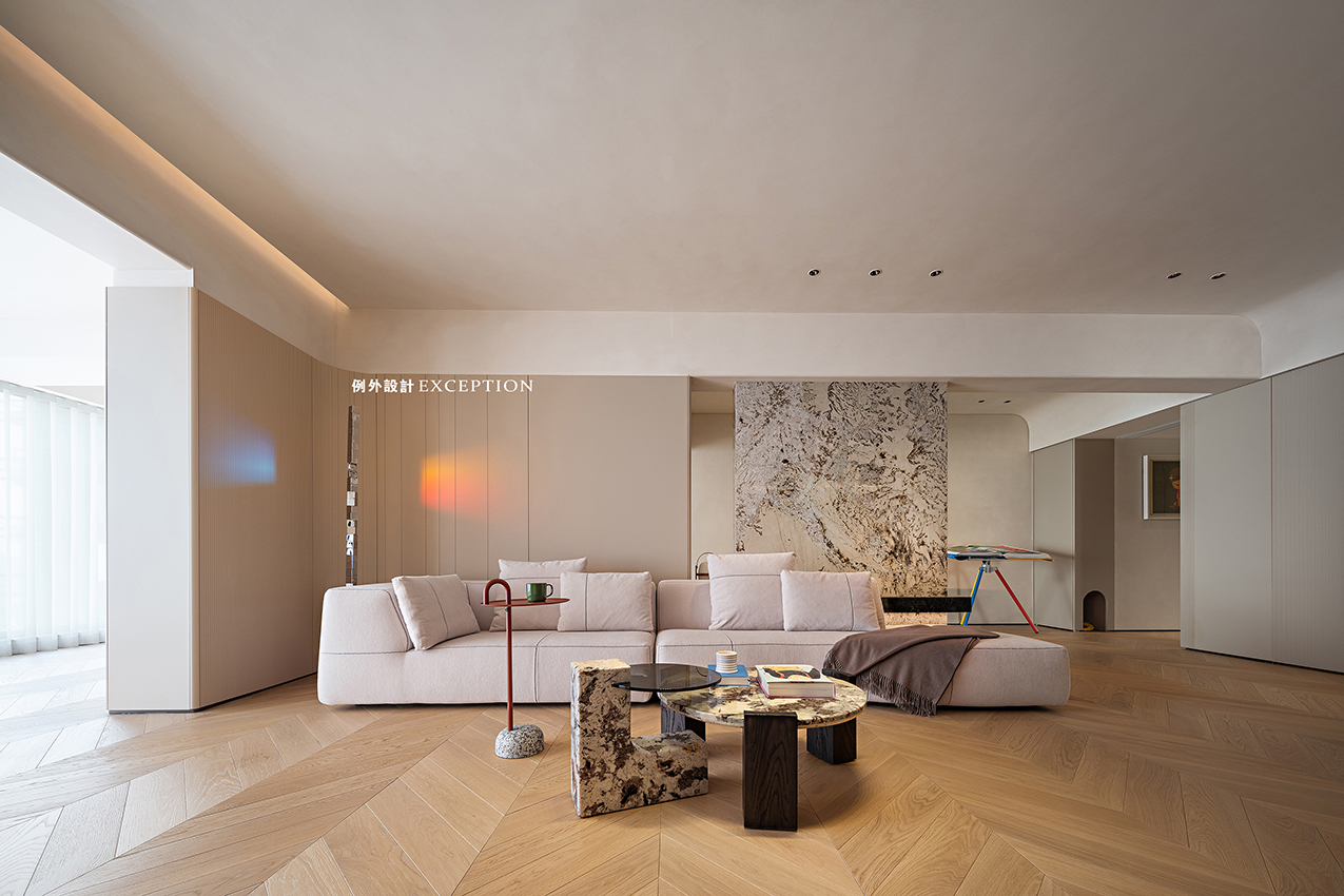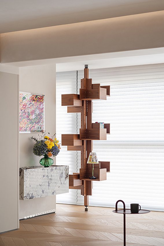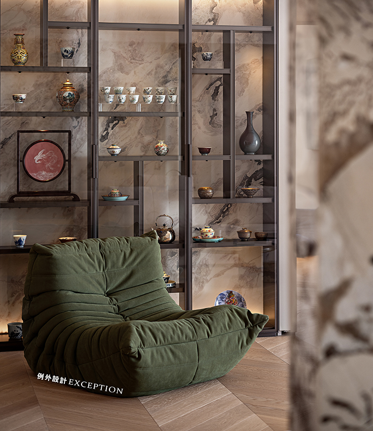 推開門眼前是一道大理石背景隔斷,流動的紋理匯聚成鳳凰高飛的模樣?!对娊洝酚醒裕骸傍P凰于飛,翙翙其羽,亦集爰止。”大理石背景呈現了更豐富的層次,也增添了家庭和睦的美好寓意。一旁的taschen經典畫冊在隨手翻閱間,有美和藝術在黯然流動。