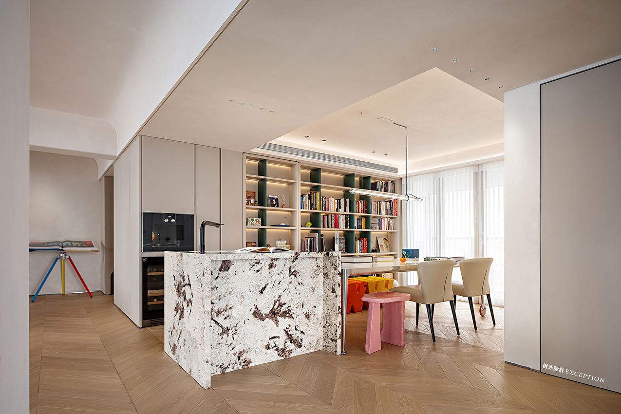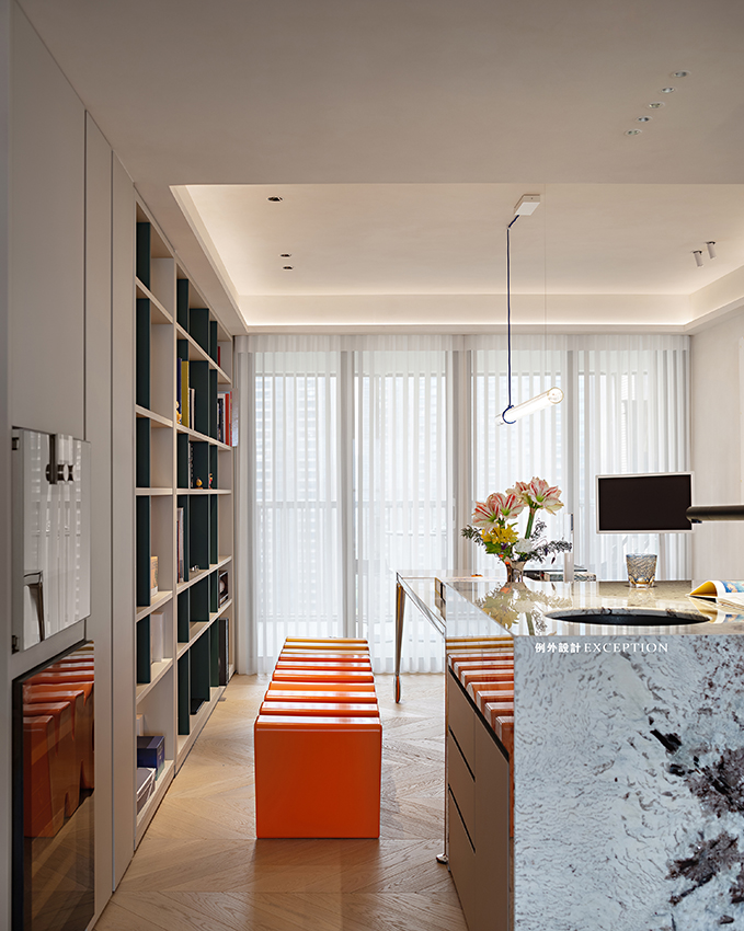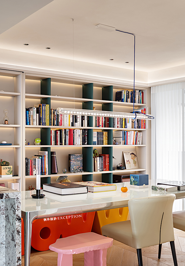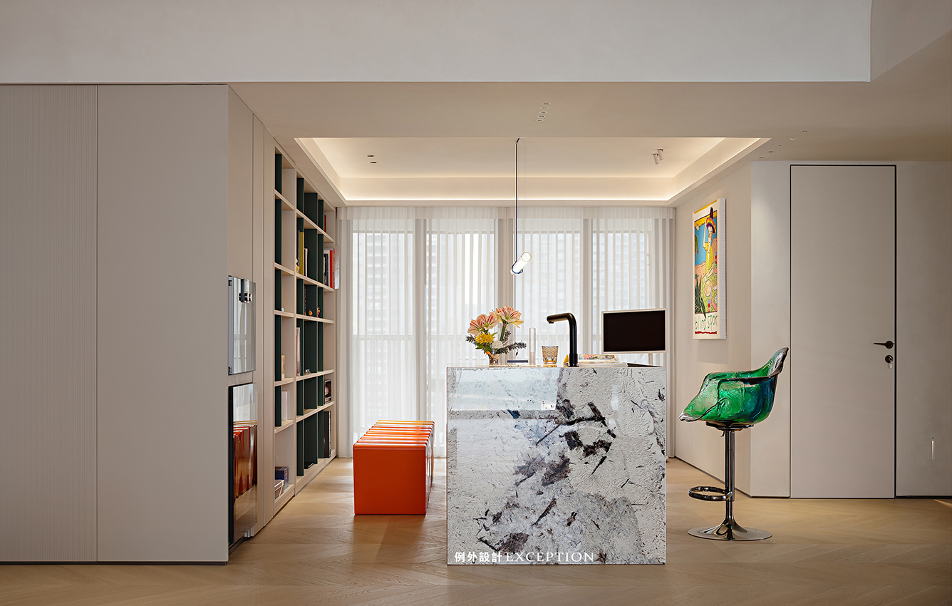 吧臺是屋主待得最多的地方,在這邊專注地辦公或是看看紀錄片,看看書,都是高質量的獨處時光。在硬裝上鴻藝源設計給予了空間無限的留白,讓屋主可以在軟裝上投射自己的品位與喜好。明亮的色彩增加了空間的靈動氣息,edra綠色花瓣椅如同大地的呼吸,在一起一伏間,躍動著生命的力量。