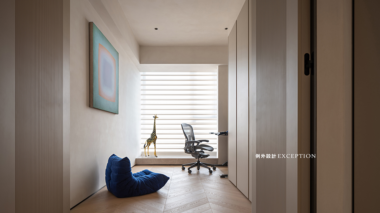 書房是使用頻率較高的空間,畫家陳若冰的作品掛在最顯眼的入口,這是屋主非常欣賞的作品。陳若冰的畫作能夠帶領觀者進入一種療愈的精神狀態(tài),每次從這里經過時,她總能感受一種平和、安靜的力量。