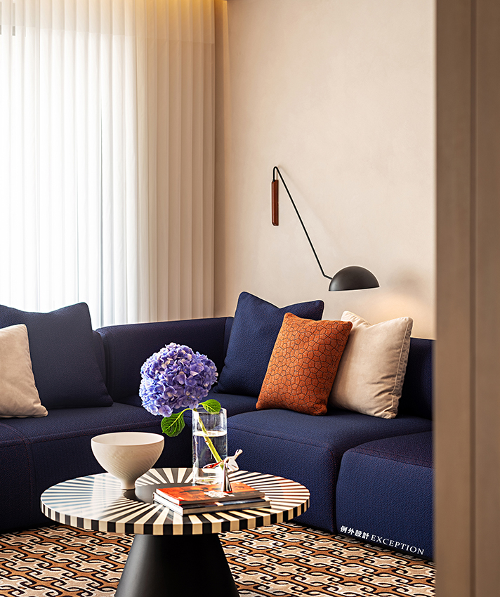 這個(gè)家的打造是一次全新的嘗試,在設(shè)計(jì)師徐靜的建議下,沙發(fā)選用了高飽和的藍(lán)紫色,裝飾鏡和茶臺(tái)底座也點(diǎn)綴了藍(lán)紫色進(jìn)行呼應(yīng),靈動(dòng)且優(yōu)雅。微風(fēng)不燥,陽光正好的時(shí)候,坐在這里感受身心的放松,感受家在一點(diǎn)一點(diǎn)賦予我們能量,一切都是自然而然發(fā)生的,沒有外物來驚擾這一片寧靜。