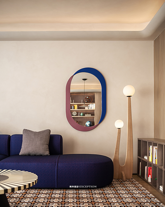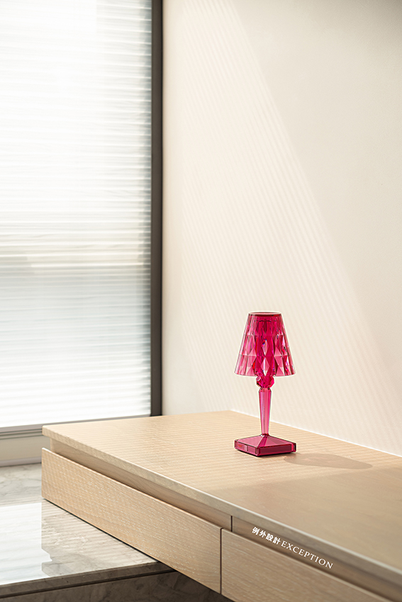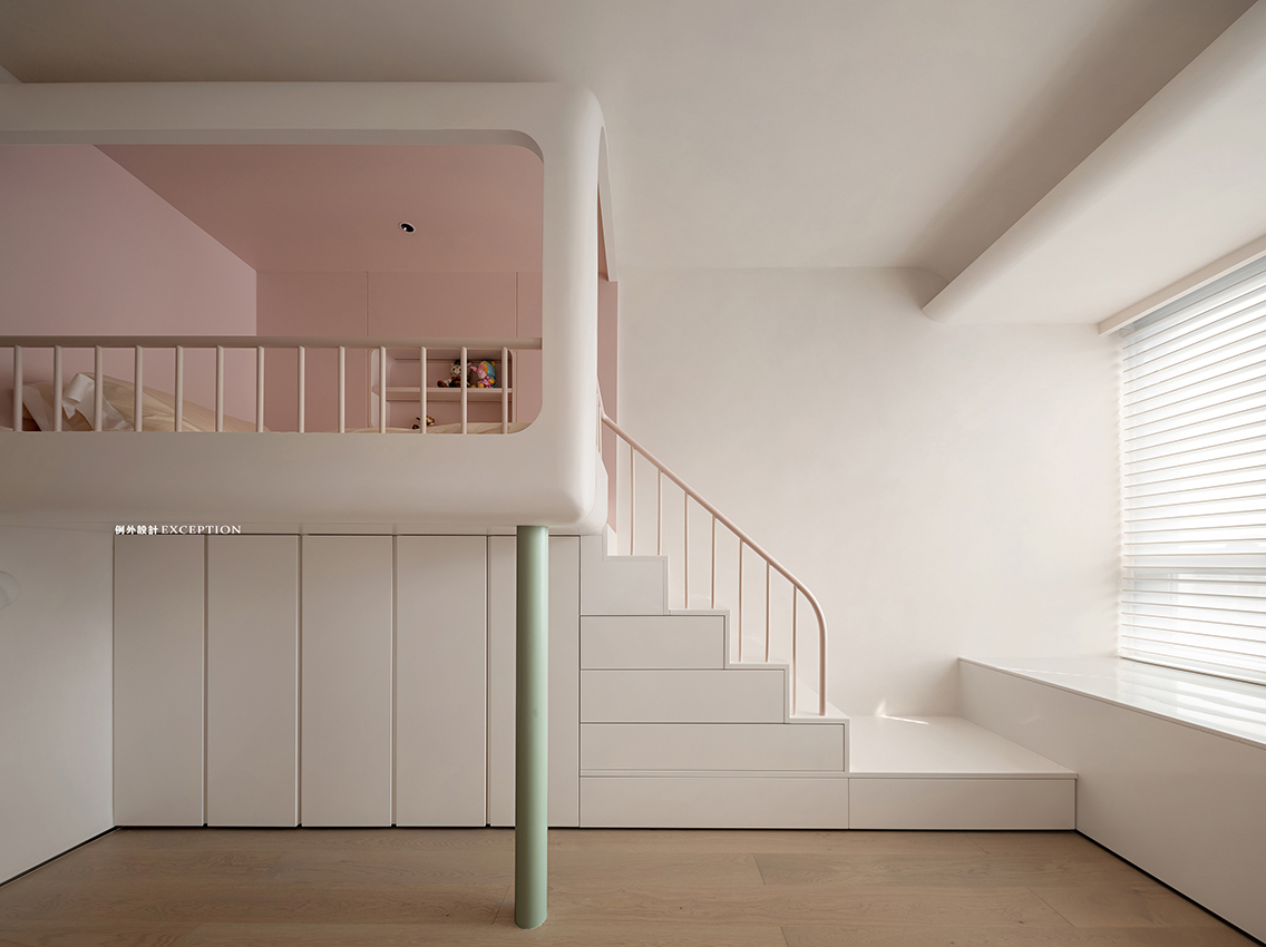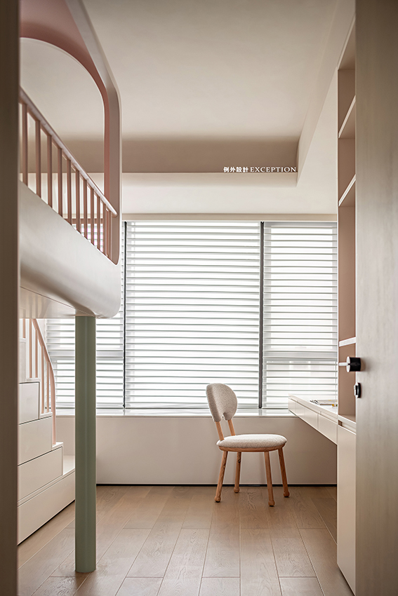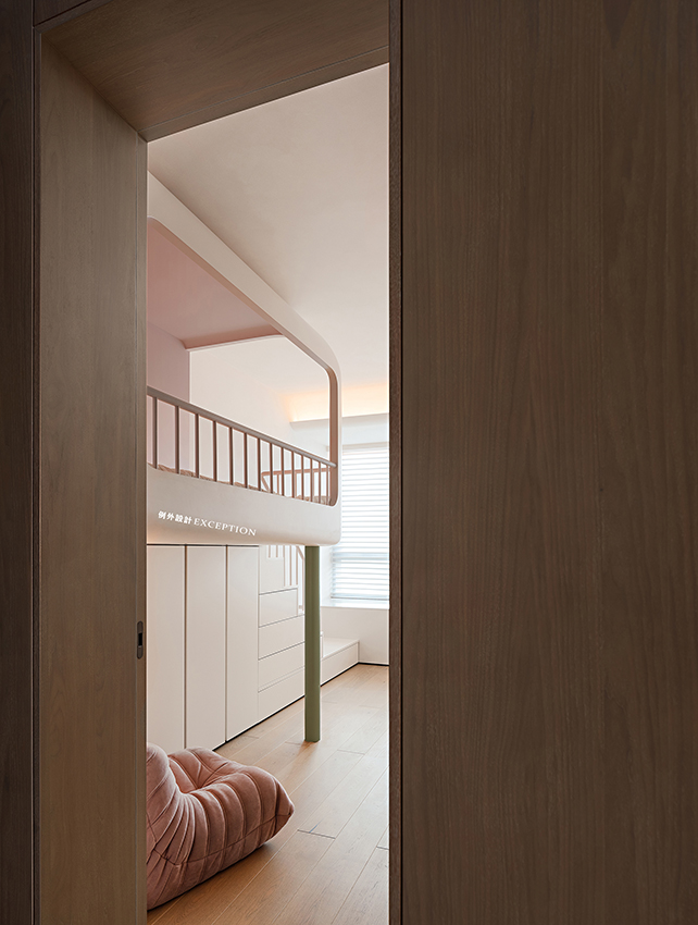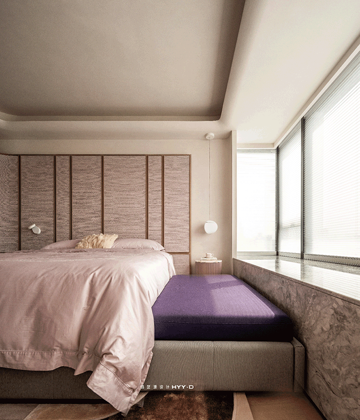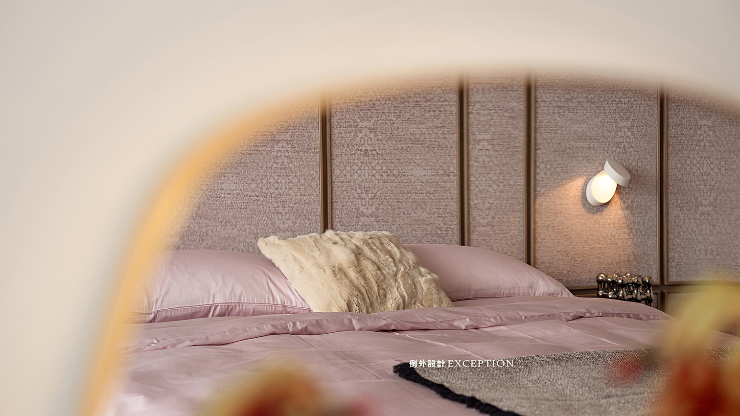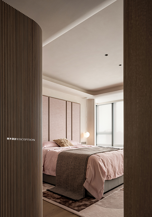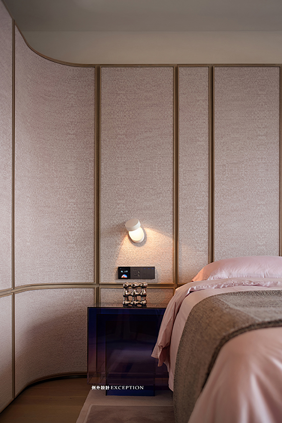 一片粉棕色的柔美浪漫視像中,嵌入藍(lán)紫色的床頭柜與藝術(shù)掛畫相得益彰。粉色背景與柜體的弧度達(dá)成一致,如同擁抱。無需門洞,也能為居者平添了安心的力量。