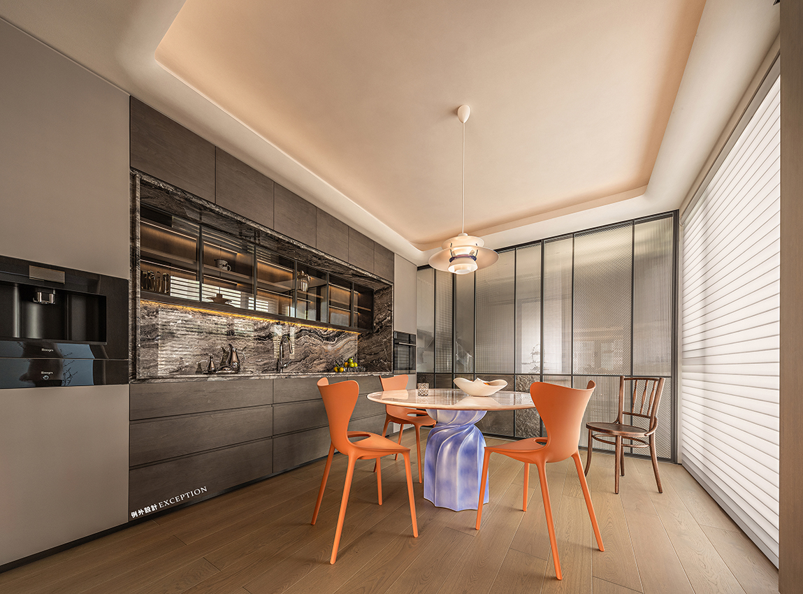 藝術(shù)玻璃推拉門形成餐廳、西廚和中廚的聯(lián)動(dòng),引導(dǎo)出流暢的生活動(dòng)線。一邊是滋味俱全的人間煙火,一邊是延伸至物象的內(nèi)心所需,方寸之間是味蕾與精神的雙重享受,視線移至窗外自然景觀,情緒得到極致表達(dá),松弛感油然而生。