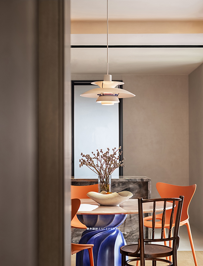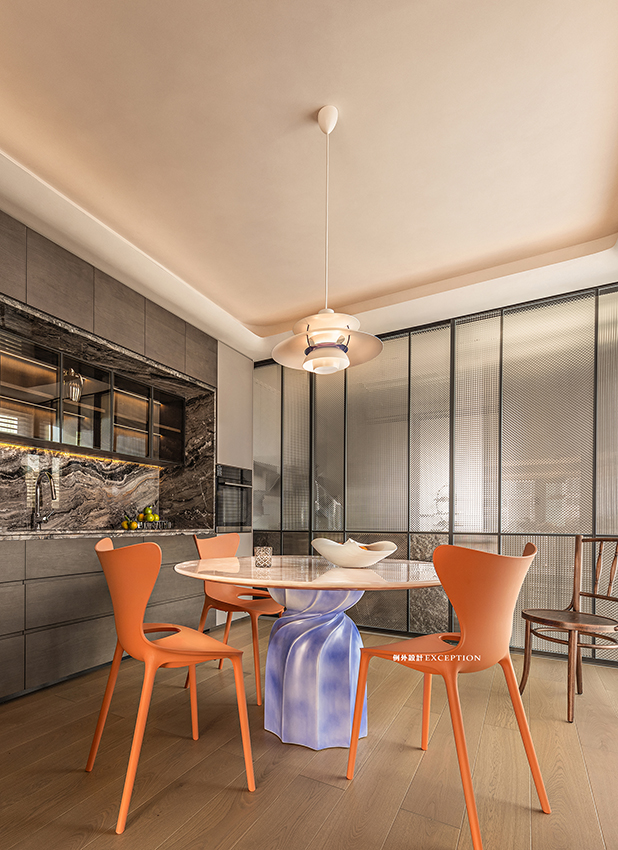 有人說儀式感就是使某一天與其他日子不同,使某一時(shí)刻,與其他時(shí)刻不同。餐廳的儀式感很大程度源于餐桌。屋主精選的粉玉大理石桌面與設(shè)計(jì)師定制的實(shí)木底座過分契合,宛若天成??梢韵胂笠患胰嗣刻靵淼讲蛷d吃飯或者做烘焙,在高顏值的餐桌前該有多么地享受。