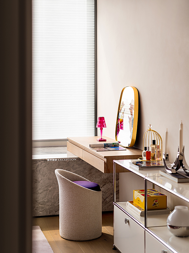 臨窗搭設(shè)梳妝臺(tái),經(jīng)典的幾何構(gòu)成為空間帶來一份簡(jiǎn)單卻實(shí)用的美。usm經(jīng)典書柜在角落也難掩光芒,不僅負(fù)責(zé)美貌,還兼顧了收納展示的任務(wù)。鴻藝源設(shè)計(jì)始終觀照人的尺度,在日常生活與藝術(shù)審美中保持恰到好處的平衡。