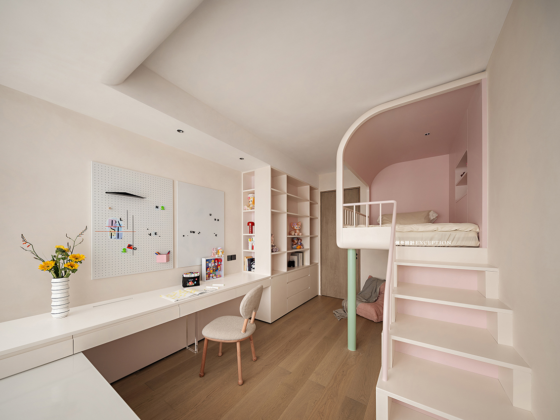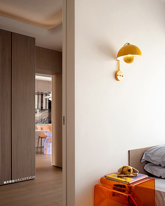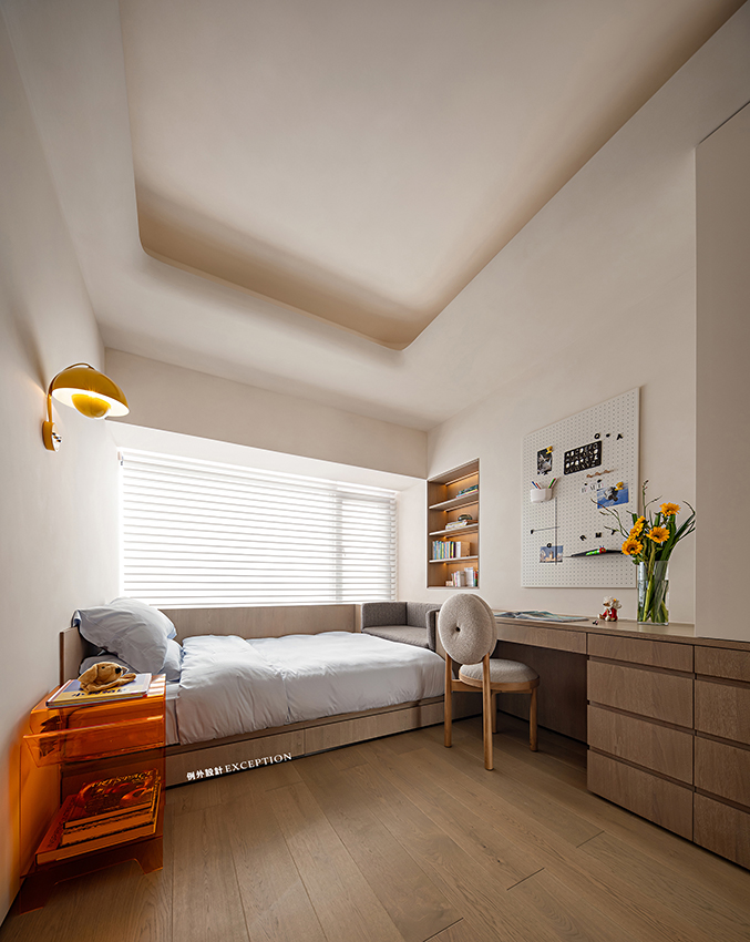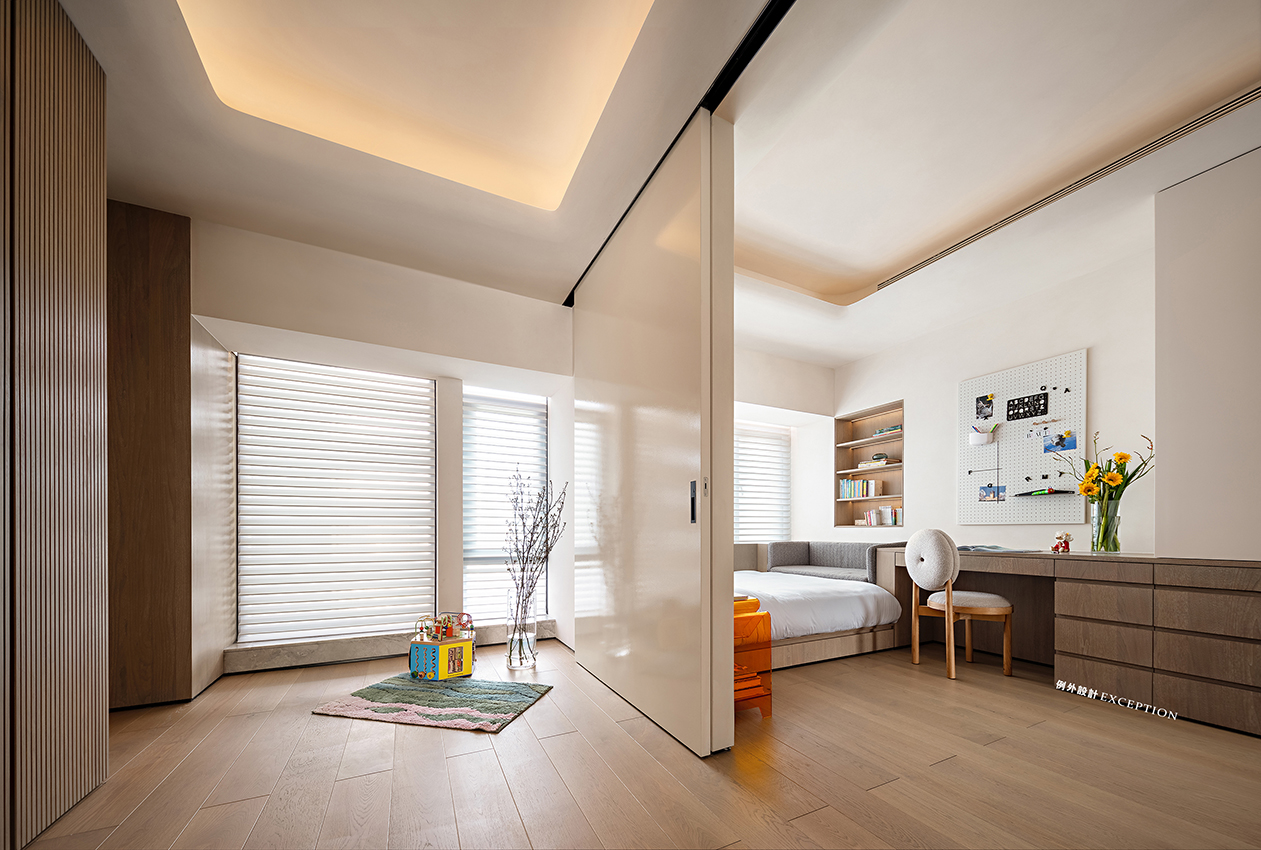 用推拉門分隔出多功能房和男孩房,生活的場(chǎng)景在專屬小天地和共享空間中自如切換。墻上洞洞板可以提前收納孩子以后的手工裝備,壁龕可以安排隨手拿取的書籍,在未來的很多日子里,這里會(huì)積攢越來越多的幸福記憶.