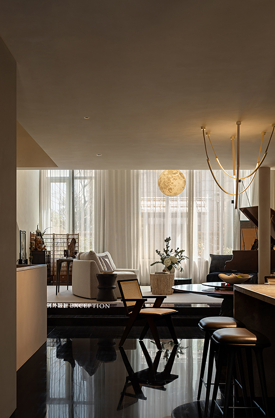 設(shè)計將往昔的器物與當下的藝術(shù)相結(jié)合,創(chuàng)造出實用價值之外的精神之美??臻g盡可能打開,讓家人的互動形成“你中有我,我中有你”的氛圍,讓能量在此溫情交互。