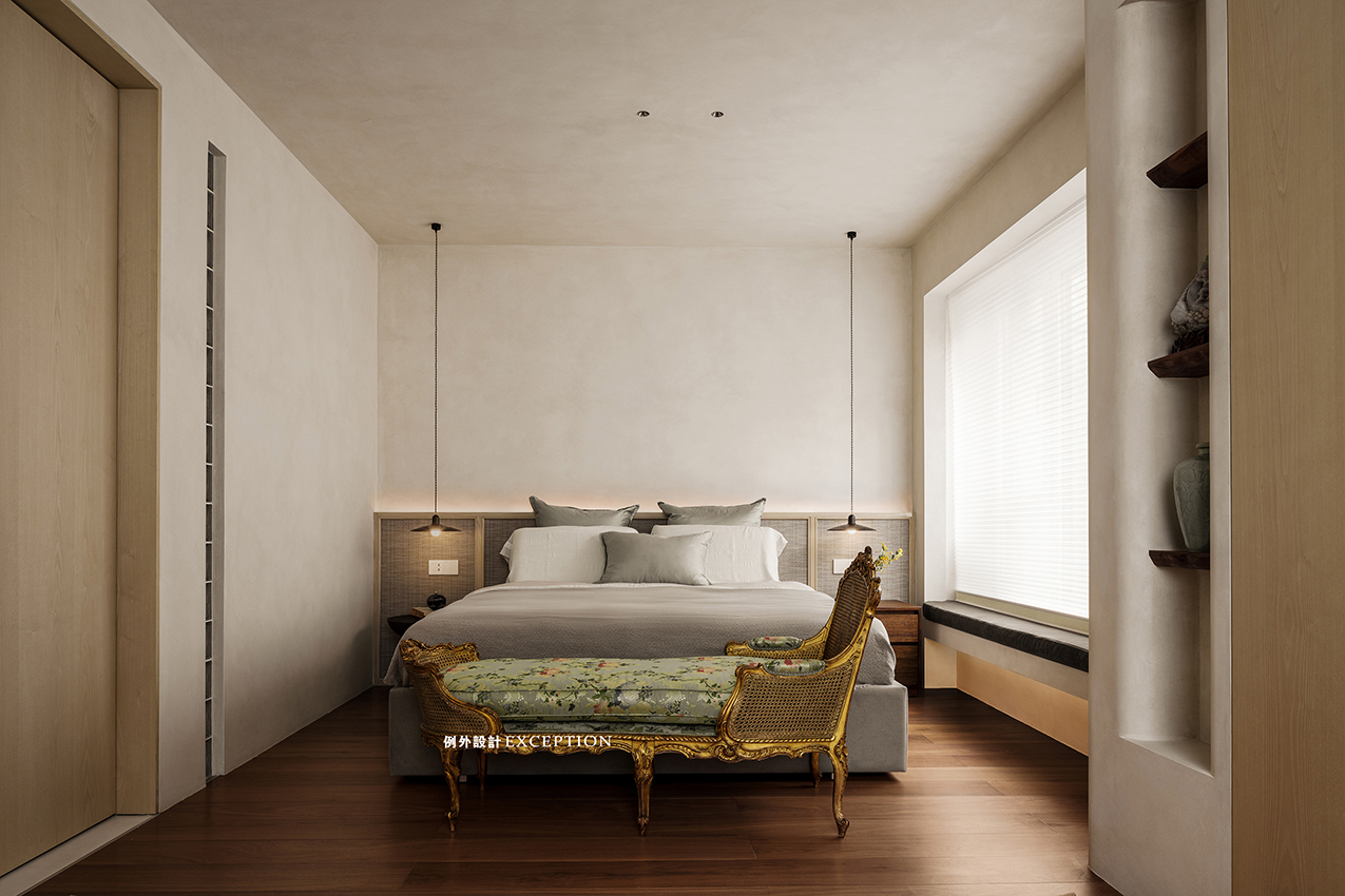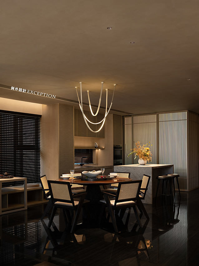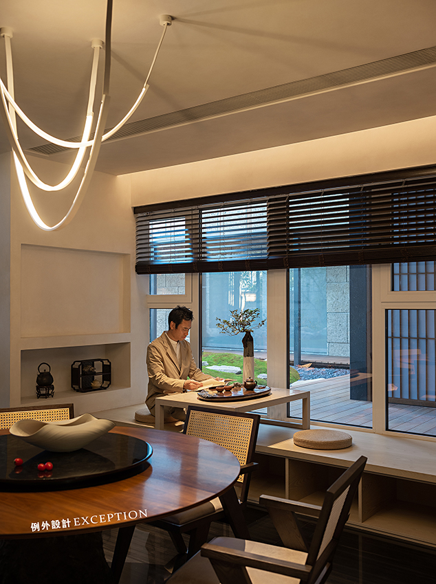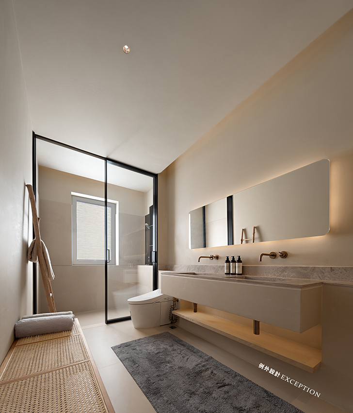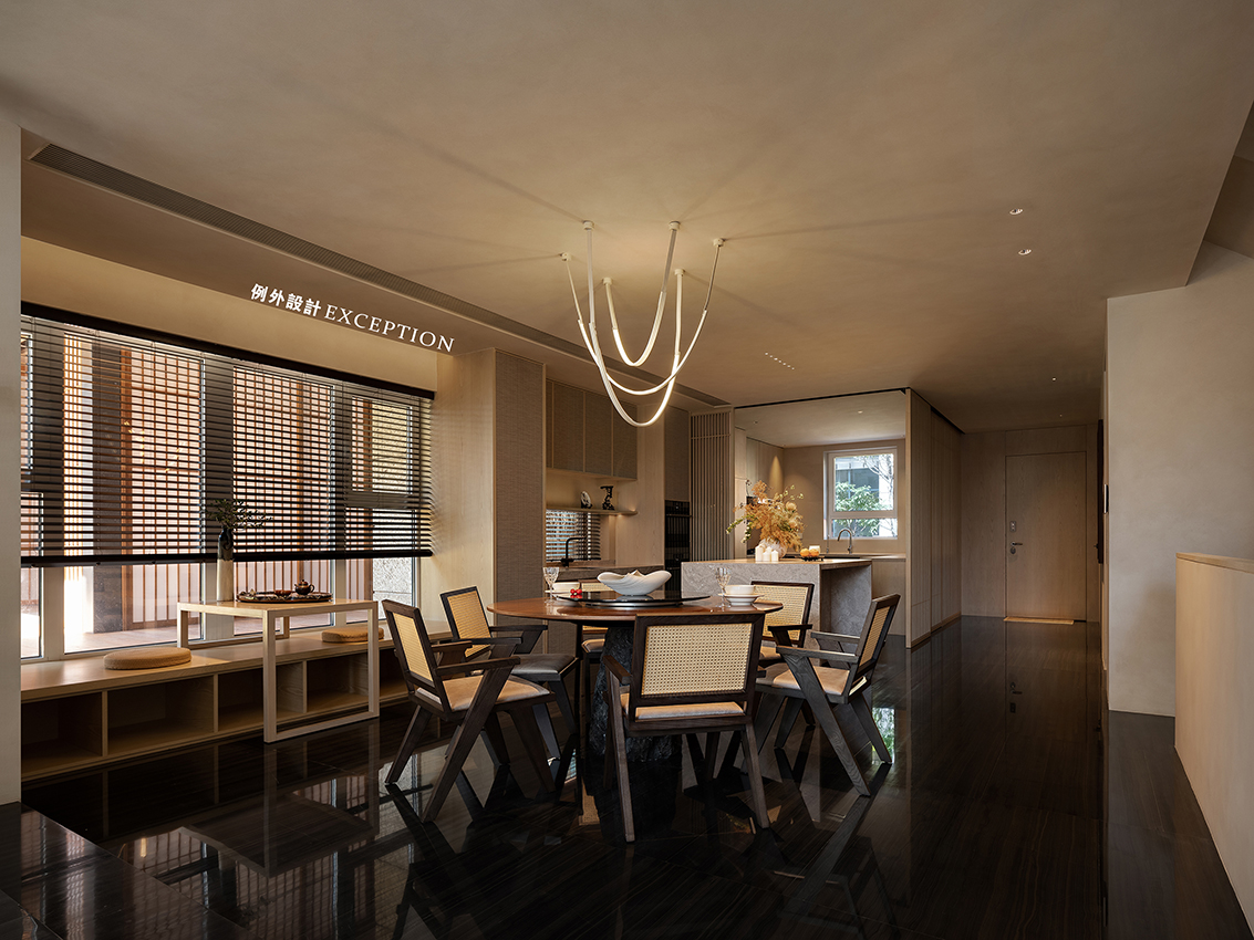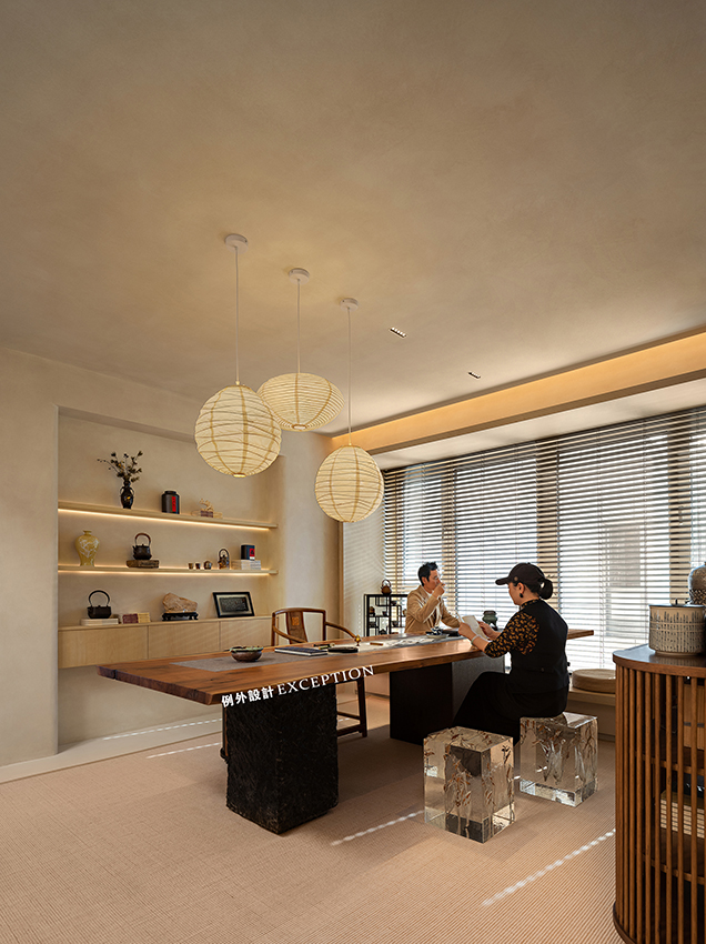 鴻藝源&例外設(shè)計以藝術(shù)涂料和實木材質(zhì)定下空間的硬裝基調(diào),柔和溫暖,包容性強。四時的園林景觀透過橫窗和格柵,將清雅和生機引入室內(nèi),讓心靈隨時都充盈著極致的閑適。