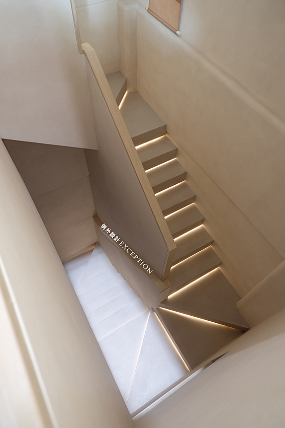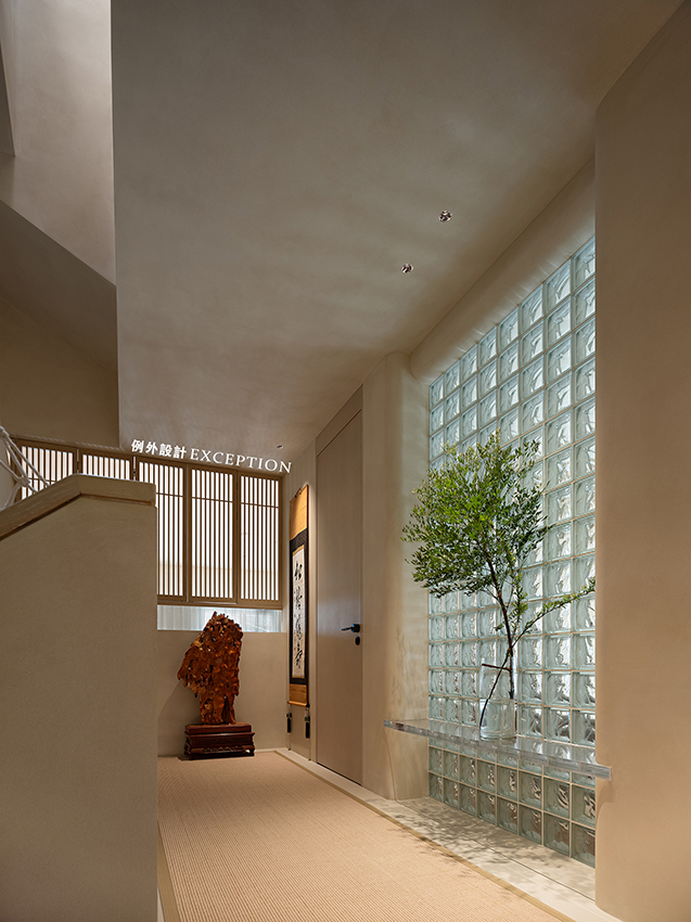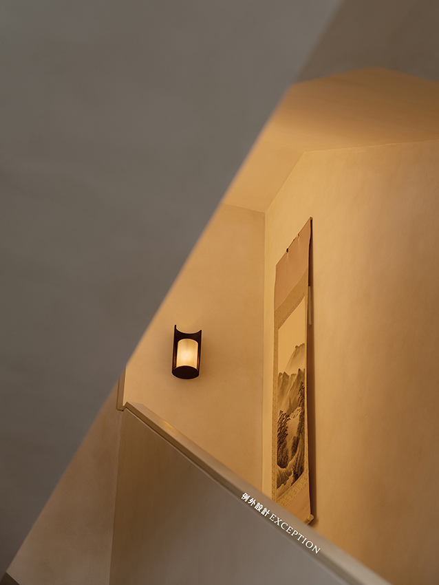 樓道是聯(lián)通不同風(fēng)景的橋梁,拾級而上,拐角處都有一幅屋主珍藏的畫作,勻凈的燈光渲染出樸拙高遠的意蘊,視線稍作停留,也會獲得漫步山水之中的禪意享受。