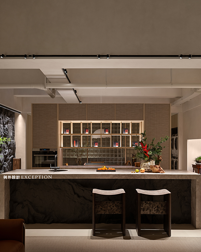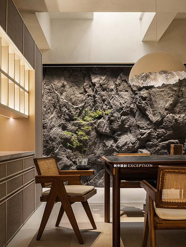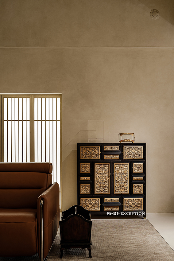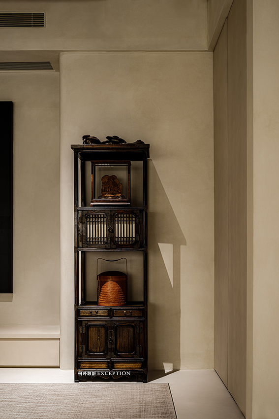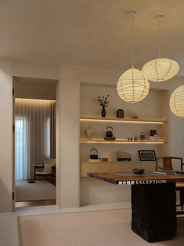 光線欠佳的地下室,設(shè)計師加入格柵窗和透光處理,引光入景,豐富了空間的層次。木質(zhì)、灰泥、天然石材和器物收藏,強化了靜謐古雅的語境,讓人處于其中,身心和洽,靈韻悠悠。