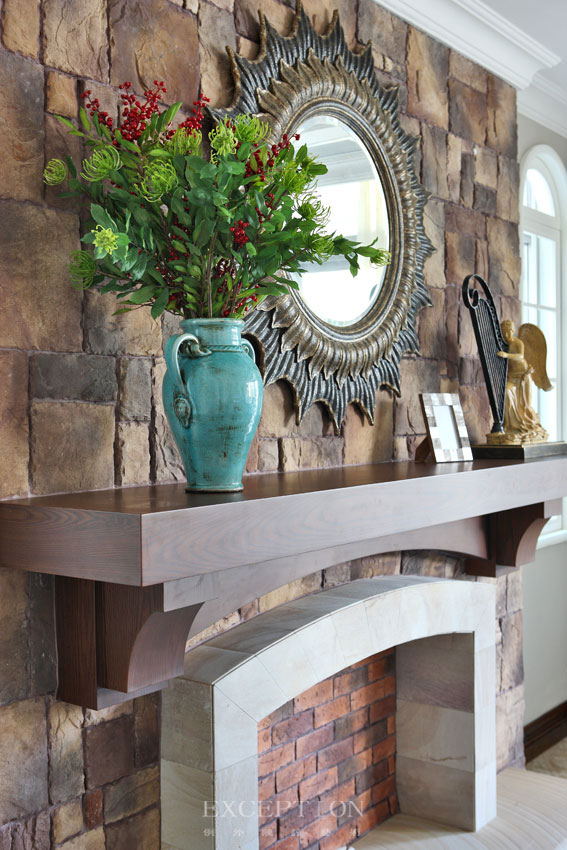 仿古太陽鏡似乎是壁爐造型區(qū)的標(biāo)配,當(dāng)然為配合背后的仿古文化石,邊框金屬的選擇應(yīng)遵從低調(diào)復(fù)古的感覺,于是巧妙利用仿古銹描摹時(shí)光的韻味,以回憶的銅色承載當(dāng)下的生活,濃濃的文藝氣息撲面而來。