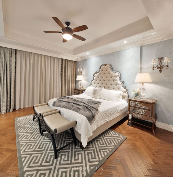 向歷史尋根溯源,幾百年前自歐洲遷徙而來的不只是勇于探索開拓的人民,還有建筑上的美學(xué)文化,美式風(fēng)格移植了歐羅巴的奢侈與貴氣,在幾百年后的今天,被設(shè)計(jì)師傳承融匯出這一室的浪漫。依然以大地色系為主導(dǎo),米色絲光絨、優(yōu)質(zhì)棉麻搭毯、素雅冷靜的白色床品交織成一個(gè)舒適靜謐的休憩空間,別出心裁的鏡面裝飾折射出主人對(duì)雅致時(shí)尚生活的品味。