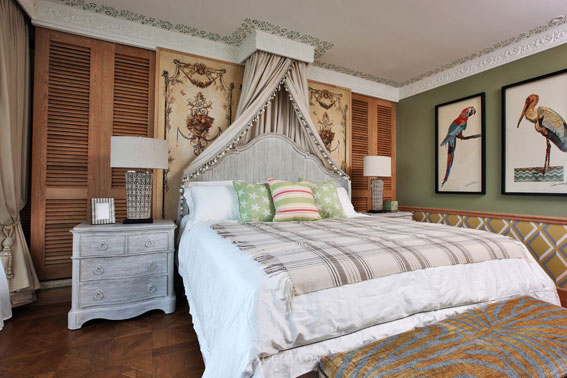 主臥空間重點從女性審美設計軟裝搭配,將東南亞的自然氣息通過法式的溫婉大氣呈現(xiàn)出來,色彩運用柔和明朗,以熱帶鳥類為主題的剪貼掛畫為空間氣氛注入幾分鮮活,與床幔后方花籃圖案的硬包背景墻相得益彰。