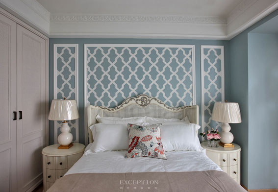 一改常規(guī)長輩房的深沉色調,轉而以清淺淡雅的天藍色鋪陳背景,軟裝飾上白色為主打,輔以淺咖點綴,明媚的色調讓居者的心也隨之年輕起來。