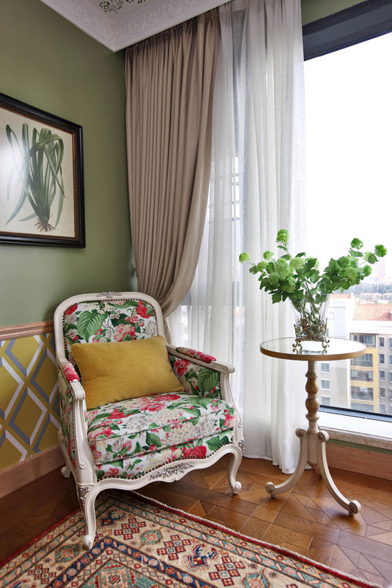一杯特調香草拿鐵氤氳著熱氣,升騰出一室的馨香,閑坐窗邊一隅,漫看窗外風景,靜待午后陽光透過紗簾漫進室內,感受法式莊園獨有的浪漫恬靜。往往,替換布藝能為家具帶來耳目一新的裝飾效果,花葉主題的軟包似乎賦予這方洛可可風格椅新生命,清麗的色調讓居者貼近自然,放松心緒。