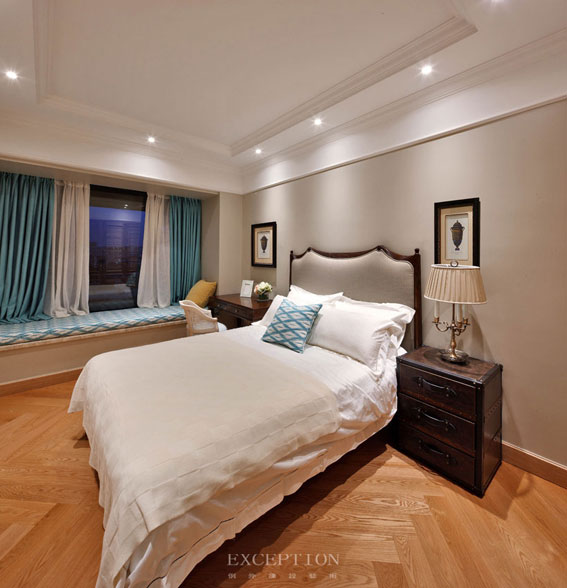 客臥色調采用了藍白相間的搭配,同樣的菱形花紋布藝讓靠包與飄窗軟墊形成呼應之美,白色純凈,藍色深邃,摒棄冗余配飾,只留一份清凈予居者。