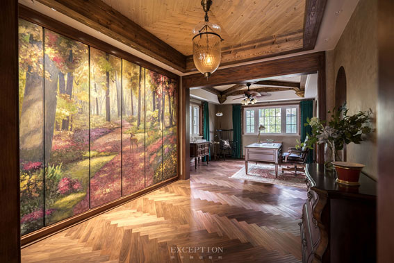書房與主臥之間的過廳衣柜手繪畫將森林和花園引入空間,加上燈光的點綴,美得不可方物。在書房閱讀與辦公的間隙,瞟一眼美好的畫面,身心瞬間放松。