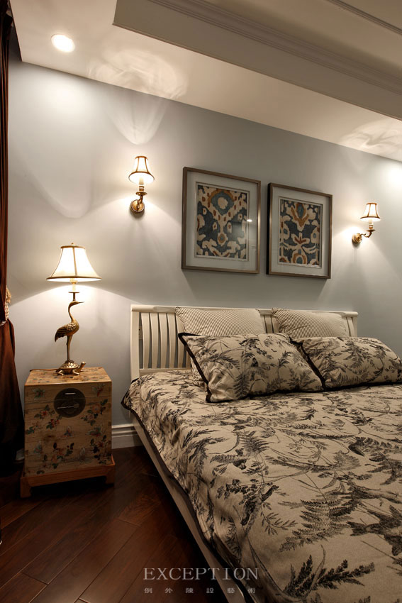 一片梨白的淡雅框定出印花墻紙的深沉格調(diào),灰藍(lán)色的花紋與孔雀壁畫一同,驕傲的炫耀著專屬它的雅致。