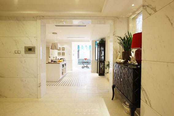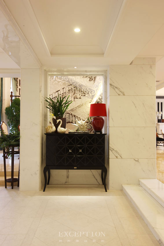 玄關(guān)設(shè)計承接房子的整體色調(diào),以白色為主,黑色的裝飾柜不失為濃墨重彩的一筆,醉是那柜臺上那一抹嫣紅,和著旁邊的綠色植物以及陶瓷鵝,厚重中迸發(fā)出活力。從玄關(guān)到客廳,雪花白大理石臺階過度自然,將兩個空間恰似無意地銜接在一起,增加了空間上的延續(xù)。