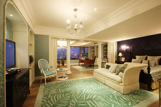 主臥書房天花的大方格設(shè)計彰顯大氣,翠綠的壁柜與地毯又透出淡雅的清新,羅馬大柱形成的開放卻隔斷格局,增加了層次感。