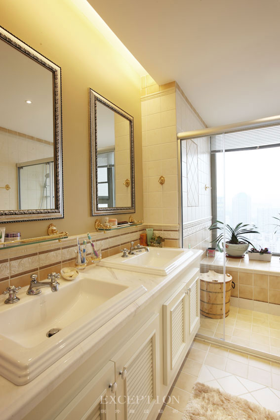 黑白分明的色調(diào),簡潔的線條勾勒出明朗的空間,貼心的雙人洗手池設(shè)計,方便主人夫婦二人的使用。