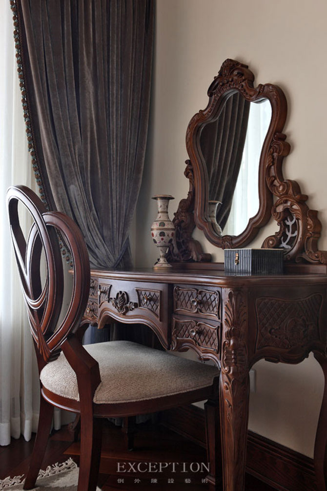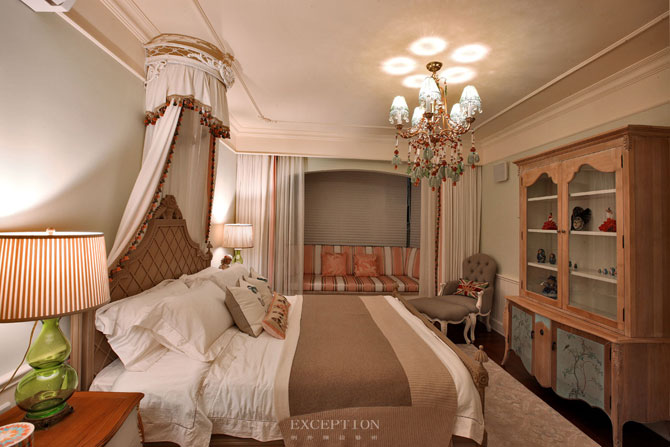 銅與水晶的搭配顯示出吊燈的別致,亦道出少女閨房的清麗;仿舊邊柜,記載著年歲逐增的往事,吾家有女的歡樂(lè),在細(xì)心裝飾中一一流露。