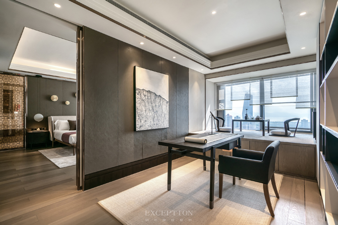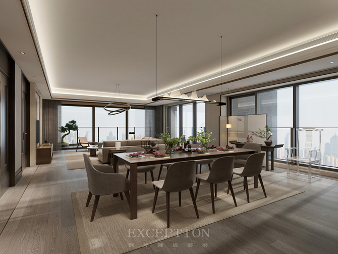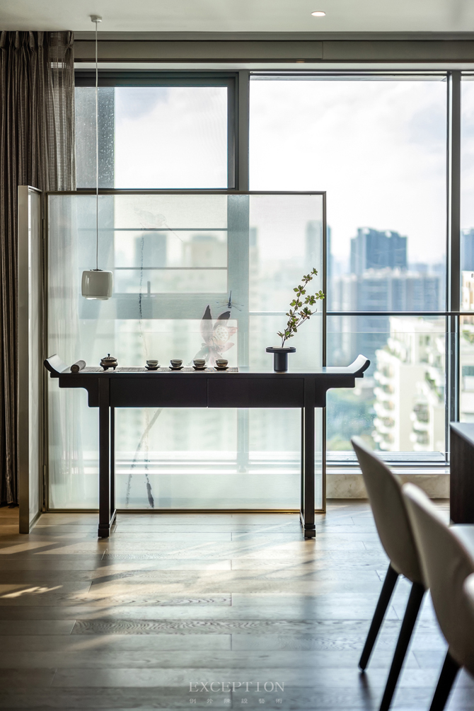 項目坐落于深圳華僑城的新天鵝堡,坐享海灣山湖的自然美景,380㎡私享空間,約7.2m寬的觀景陽臺,南北通透,三面采光,四室三廳,這樣開放與獨(dú)立兼顧的空間,給了設(shè)計與生活多種互動的可能性。業(yè)主是一對恩愛夫妻,他們對清雅閑適的生活有著深深的渴望。鴻藝源設(shè)計將中式情韻以簡雅靜寧的格調(diào)呈現(xiàn)出來,讓居者在木作的紋理、陽光的滲透、清茶的幽香中,品味生活的煙火氣與安適感。