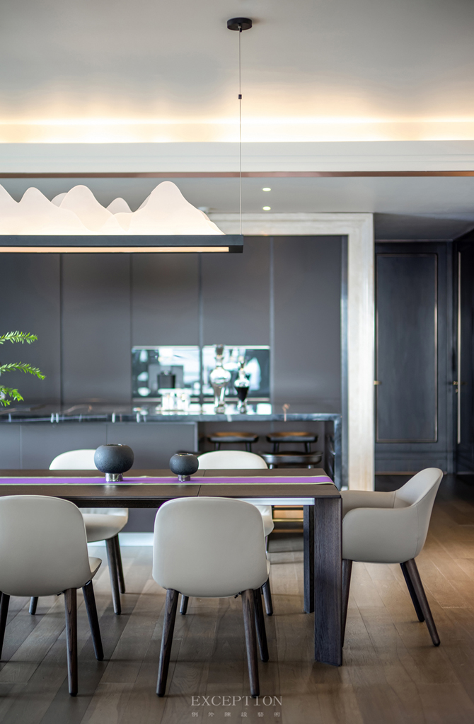 餐廳延續(xù)會客廳空間的基調(diào),臻選意大利 Poliform 餐桌椅,精致的亞克力山水造型燈飾,以簡單的形制禮遇生活之美。