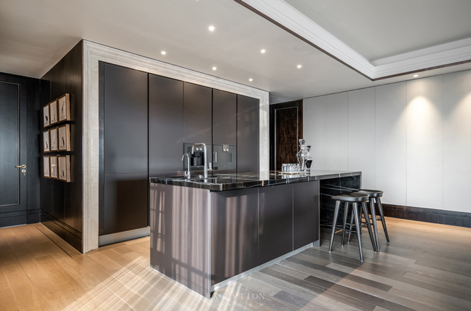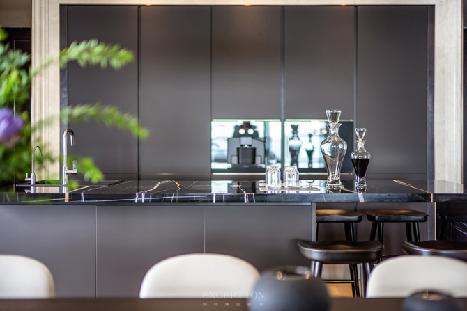 西廚島臺采用大理石與木材無縫貼合,睿智的黑在空間中煥發(fā)著張力,突出設(shè)計臻選的態(tài)度與品質(zhì)的精尚。