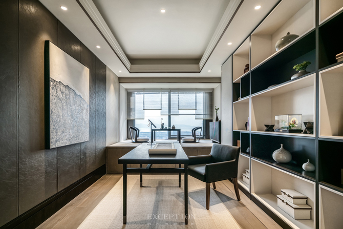 約64㎡的通透主臥套房設(shè)計,以三進(jìn)的方式將書房、臥室、主衛(wèi)進(jìn)行構(gòu)設(shè),使空間具備更好的秩序感與私密性。書房以簡凈的黑白色調(diào)對話,現(xiàn)代極簡語匯與中式情韻在空間中相融相生,分外靜雅。飄窗區(qū)被設(shè)計為茶室,原木、清茶、松葉、花卉交匯在一起,清甜而微香。晨間的日光柔和,夜晚的月色明澈,一杯清茶,共待流年。