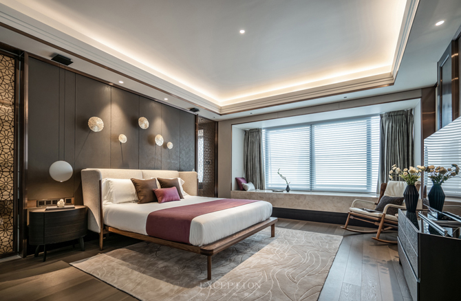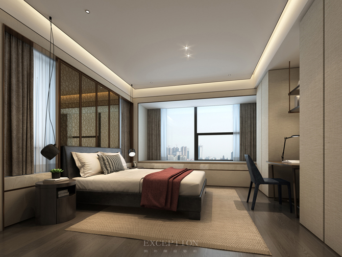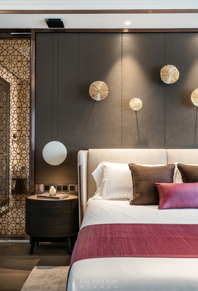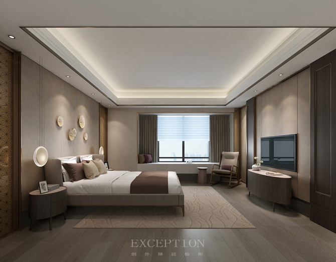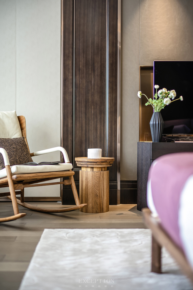 主臥無主燈設(shè)計,而是將燈光收納于吊頂內(nèi),使室內(nèi)顯得更為柔和安適。設(shè)計將真正的尊享藏于每個細(xì)節(jié),精細(xì)打磨的墻面與木制地板、細(xì)膩柔軟的暖棕色床品,通過材質(zhì)的光感隱透簡凈高雅的質(zhì)感美學(xué)。