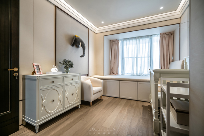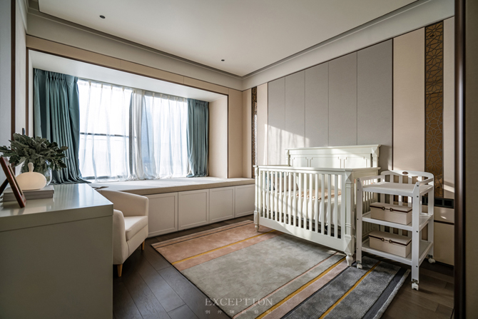 兩間嬰兒房以淡粉與水藍(lán)作為區(qū)隔,配備成對的嬰兒床、衣櫥,還有一件件童趣別致的玩具。在設(shè)計中,鴻藝源設(shè)計貫穿著對未來生活的考慮,為居住空間留有成長與進(jìn)化的可能。嬰兒房及兒童娛樂室均在背景墻的設(shè)計上做了預(yù)留手法,隨著孩童的成長,家長只需將家具進(jìn)行替換,無須進(jìn)行二次裝修。