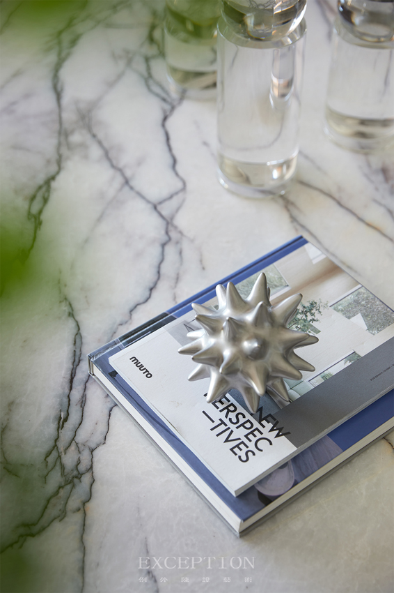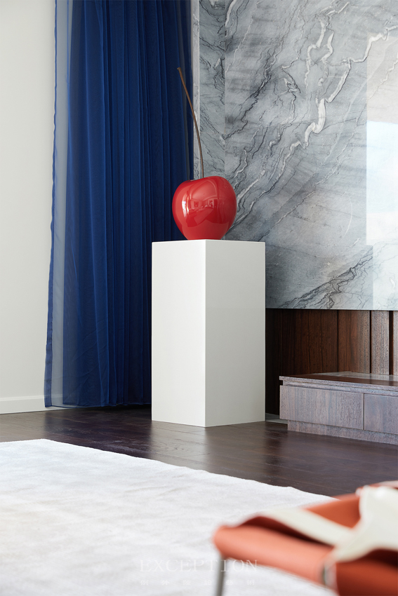 花白大理石結(jié)合空間光影的雕刻感,與木制地板的溫潤(rùn)形成對(duì)比,材料的表現(xiàn)力在簡(jiǎn)雅的環(huán)境背景下被發(fā)揮到了極致。背景收納墻的滑門以細(xì)框黑線勾勒,時(shí)尚而帶有一點(diǎn)俏皮。普魯士藍(lán)色輕質(zhì)紗簾的介入,呼應(yīng)著海景的靜謐與深邃,呈現(xiàn)空間跳躍的韻律感。角落一隅布設(shè)了一個(gè)飽滿欲滴的蘋果造型藝術(shù)裝置,極致的色彩、形象與表現(xiàn)力吸引著觀者的視線焦點(diǎn)。